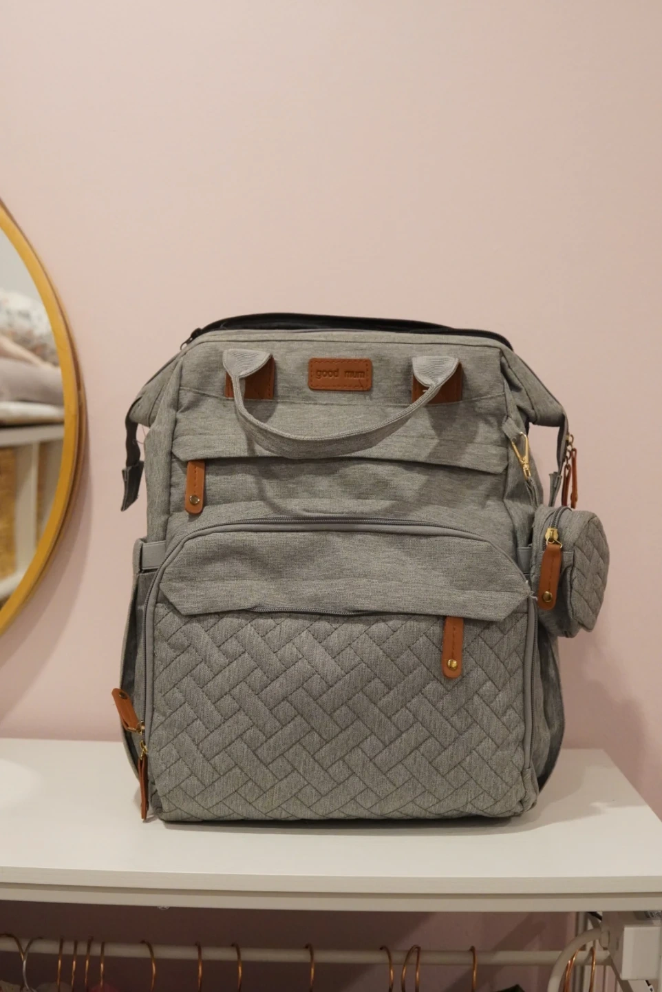 This is a gray diaper backpack from Good Mum. It's made of durable fabric and comes with a small matching pouch. Plenty of pockets for organization!