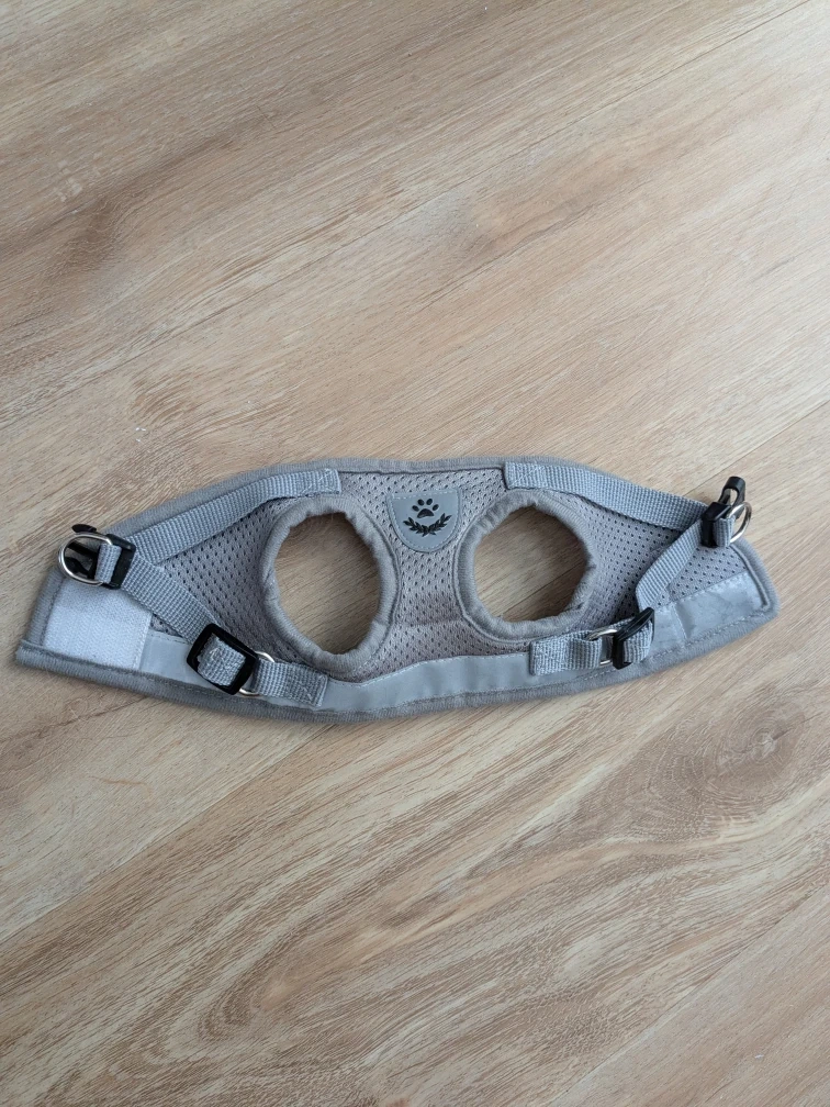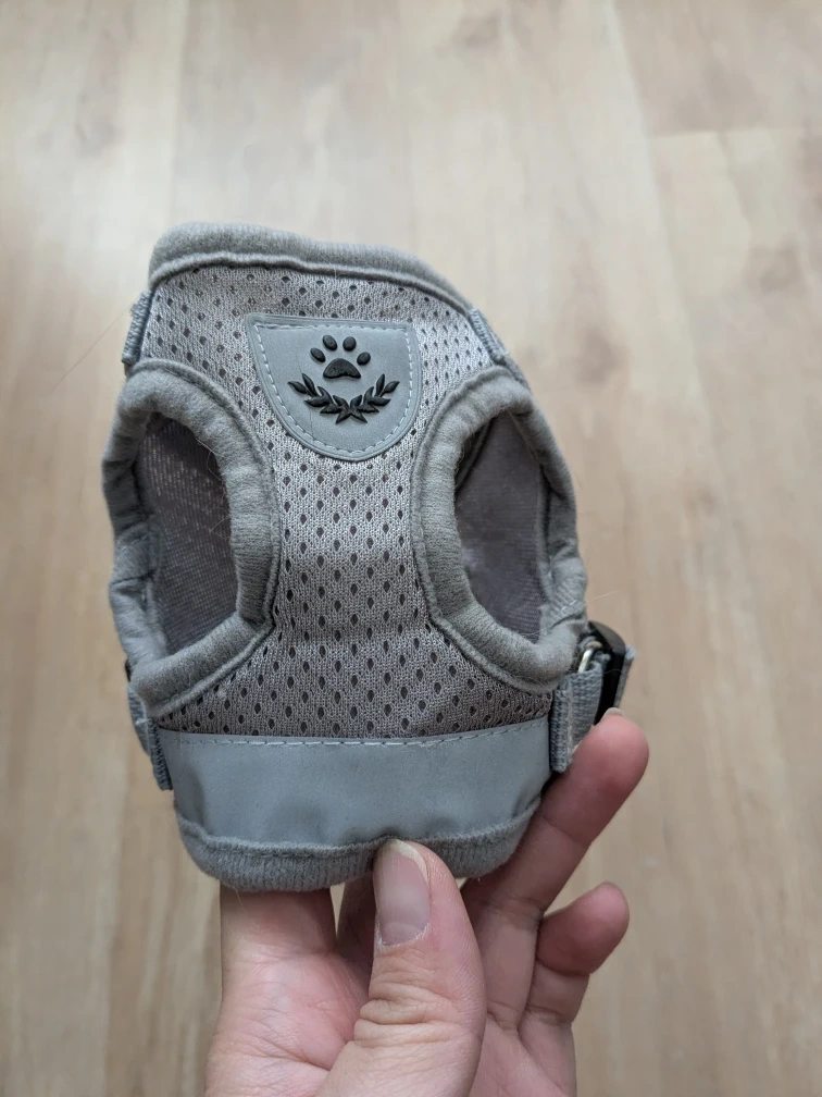 Selling a gray dog/cat harness in size XS! It's in great condition and features a cute paw print design. Perfect for small pups or cats.