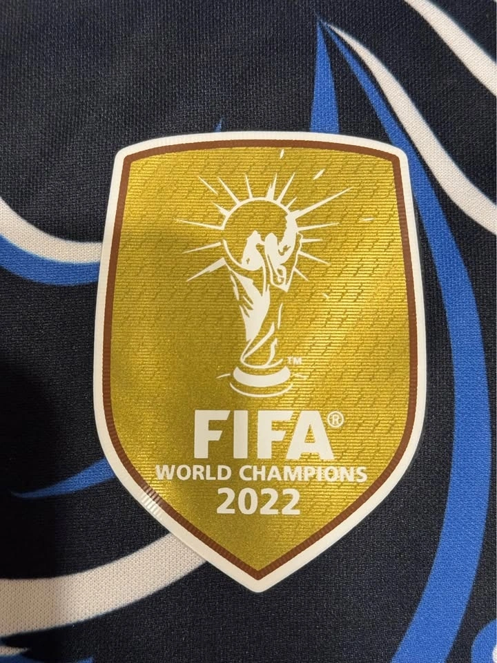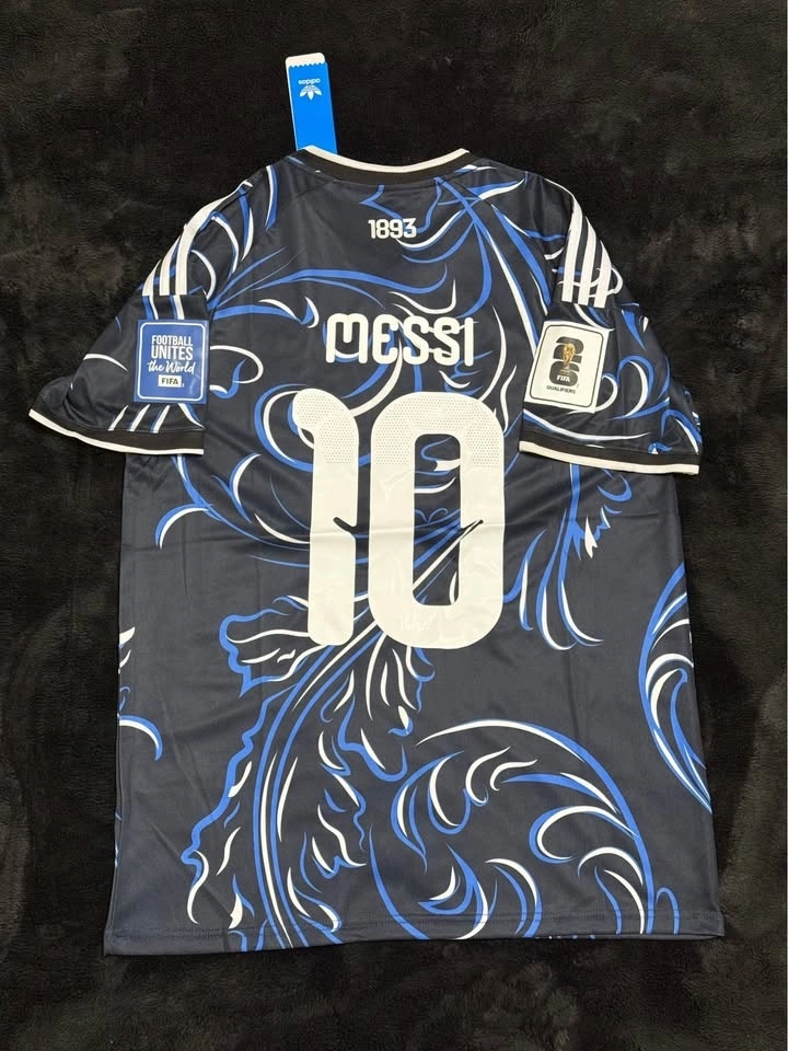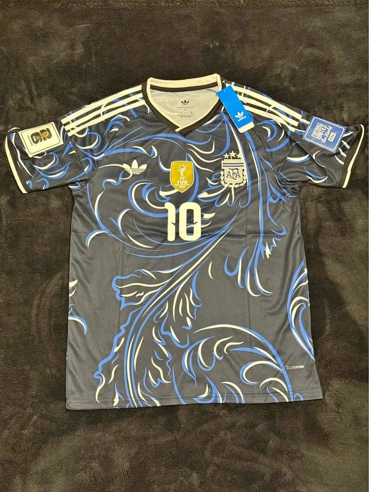 Argentina 2026 World Cup Away Jersey featuring Lionel Messi #10 in the iconic dark blue artistic design. This jersey includes the World Champions FIFA patch, AFA crest, and a bold all-over pattern inspired by Argentina’s football heritage. A great piece for fans, collectors, or casual wear.