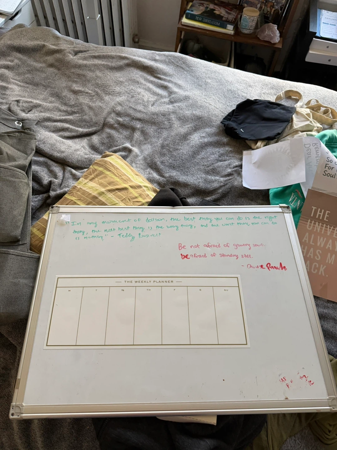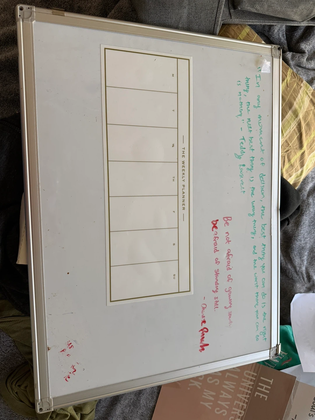 This is a whiteboard weekly planner. It has a space for each day of the week. It's great for organizing your schedule! 23x 17