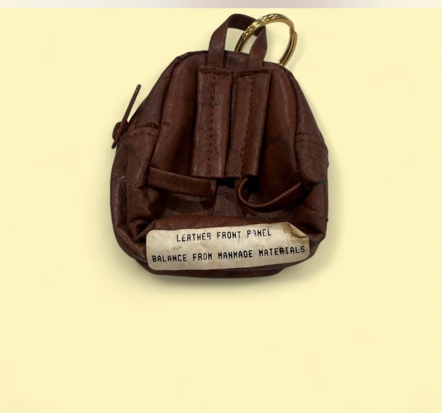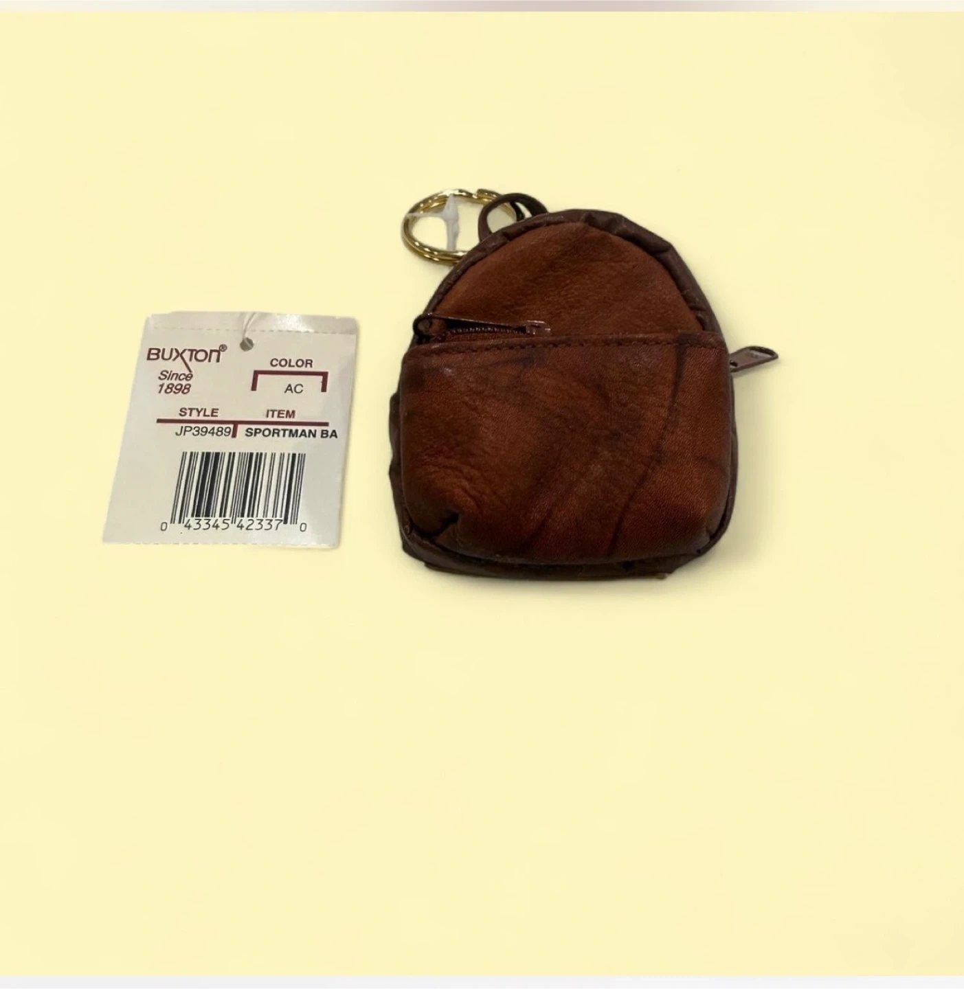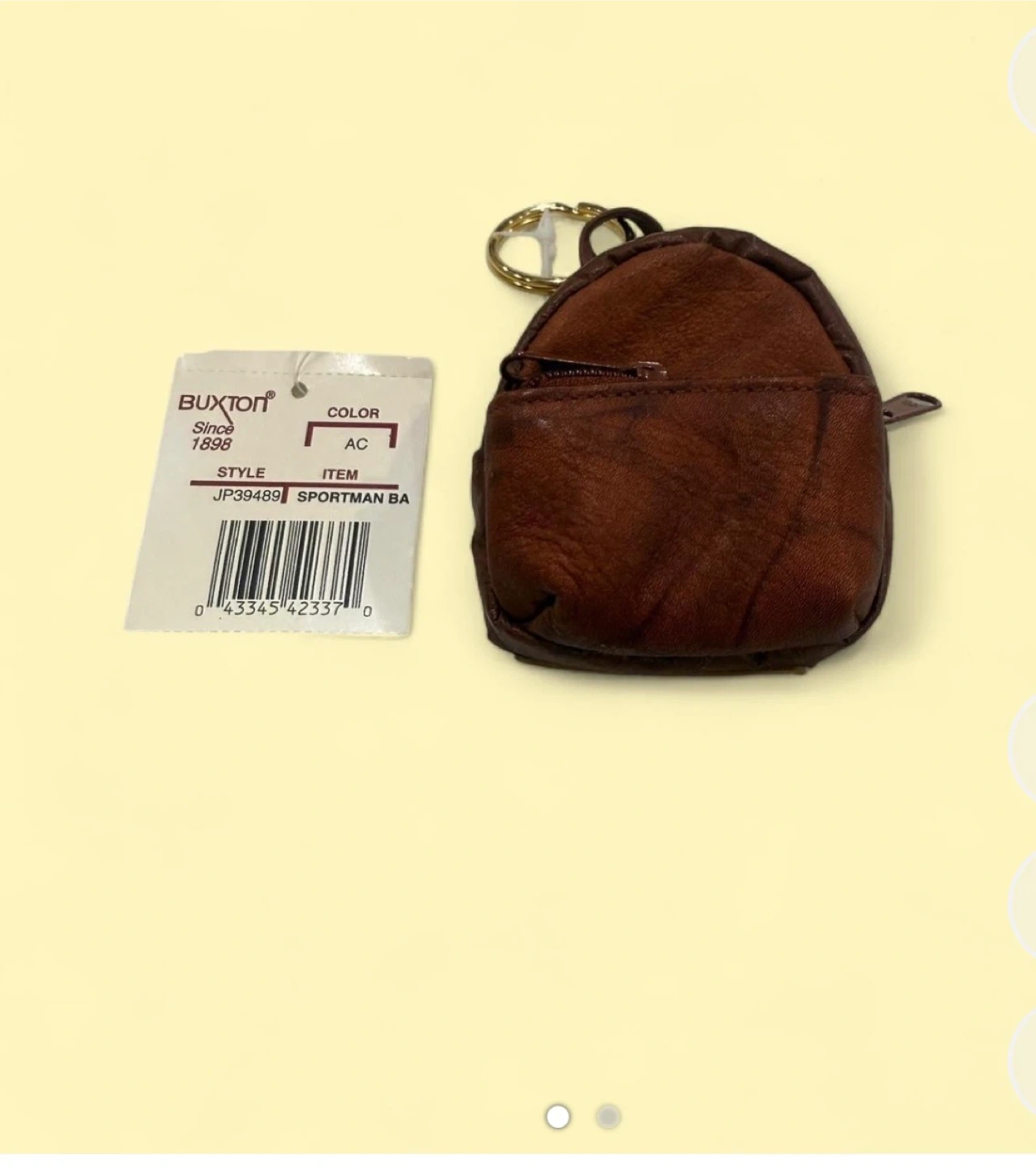 This is a Buxton mini backpack keychain. It features a leather front panel and balance from man-made materials. The color is AC. It's a stylish accessory for your keys!