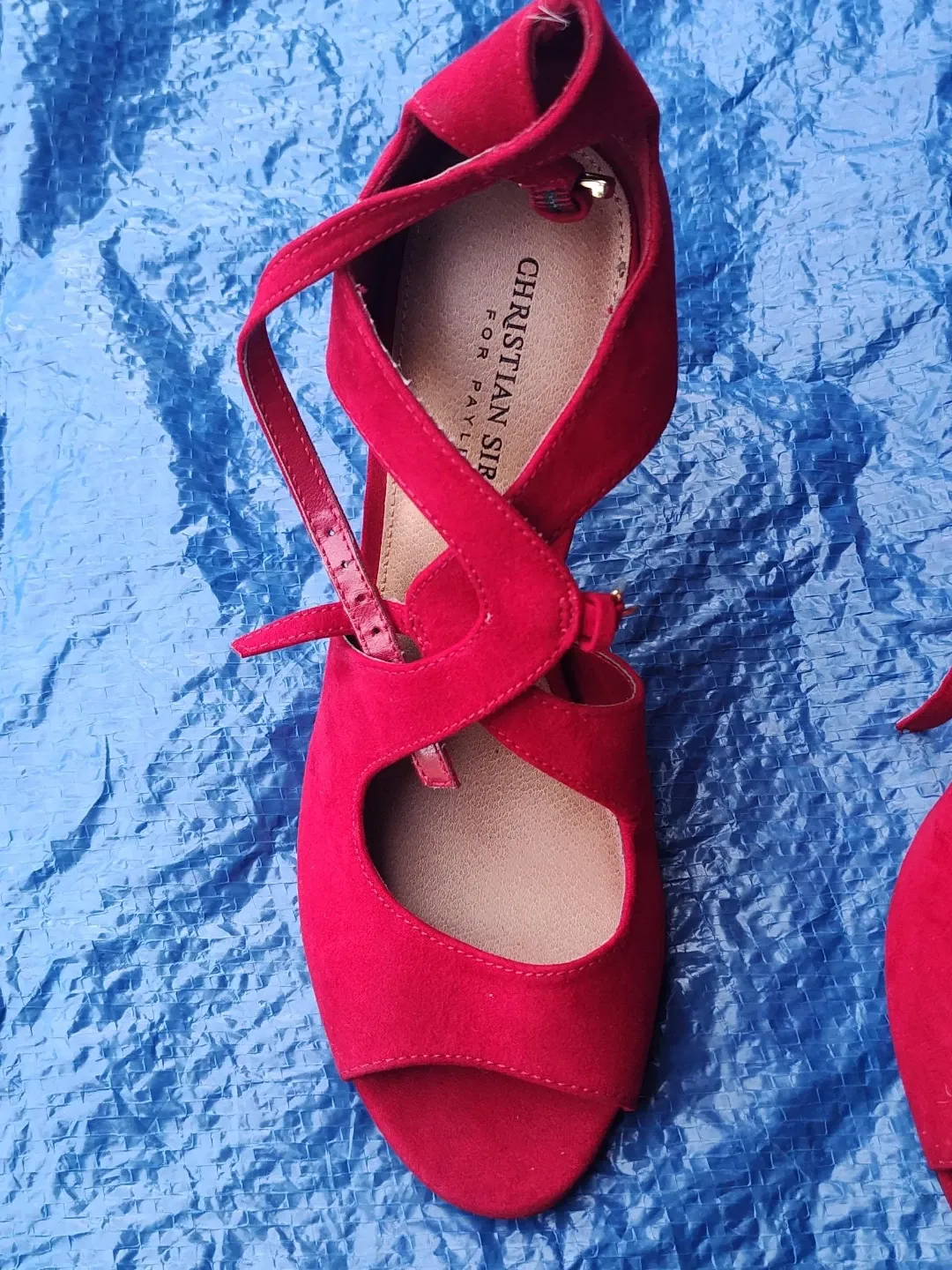 Christian Siriano red suede heels. Peep-toe design with strappy accents. Material is suede. A stylish choice for any occasion!