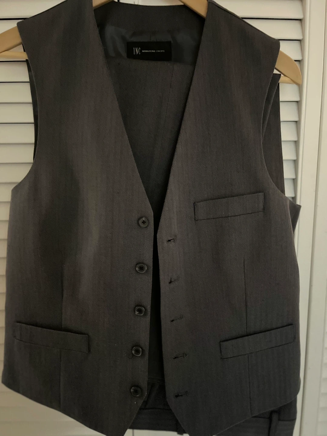 10Selling an INC International Concepts suit. The jacket is a size M, and the pants are 30 waist and 32 lengthens and vest!
