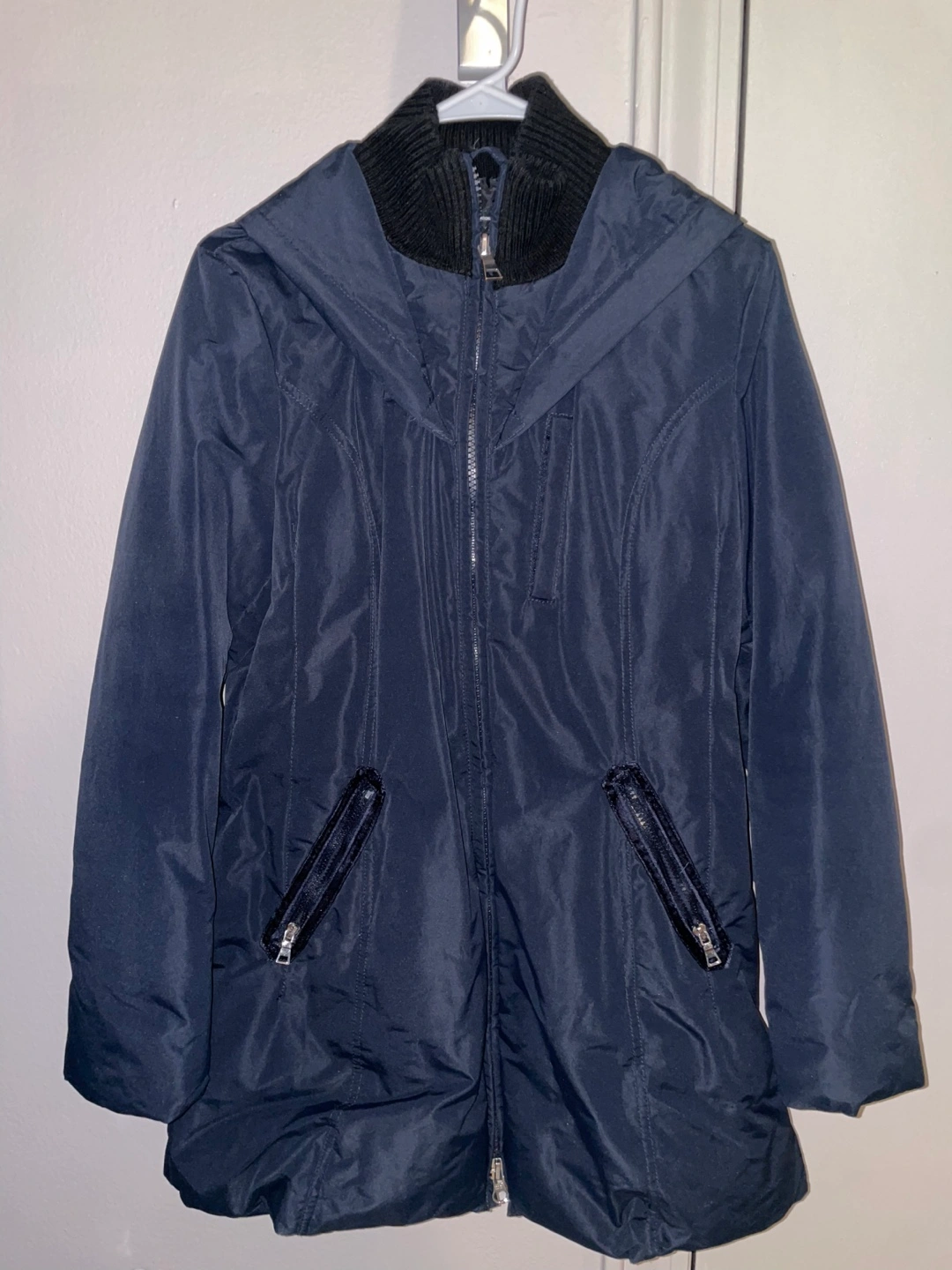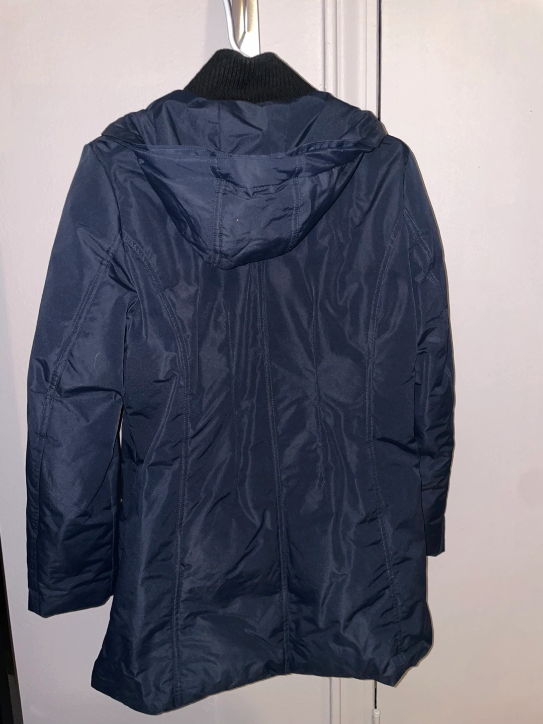 52Navy blue hooded puffer jacket. Size Medium. Features a ribbed collar and zipper closure. Two zippered pockets. Include removable collar fur Perfect for Chicago’s winter Very good condition✨ It has no stains, no loose seams, and no imperfections‼️ About this item Fabric type 100% Polyester Care instructions Machine Wash