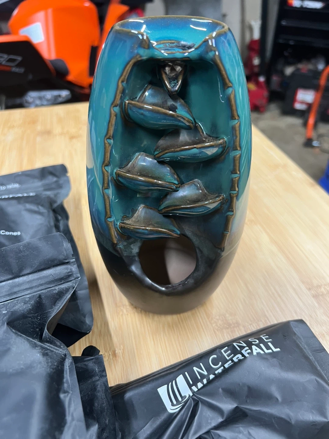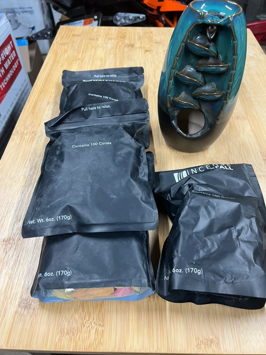 I'm selling an incense waterfall backflow burner. It's a beautiful decorative piece that creates a relaxing ambiance. It comes with several packs of incense cones, each containing 100 cones. Each pack has a net weight of 6oz (170g). Enjoy the calming effect of the incense waterfall!