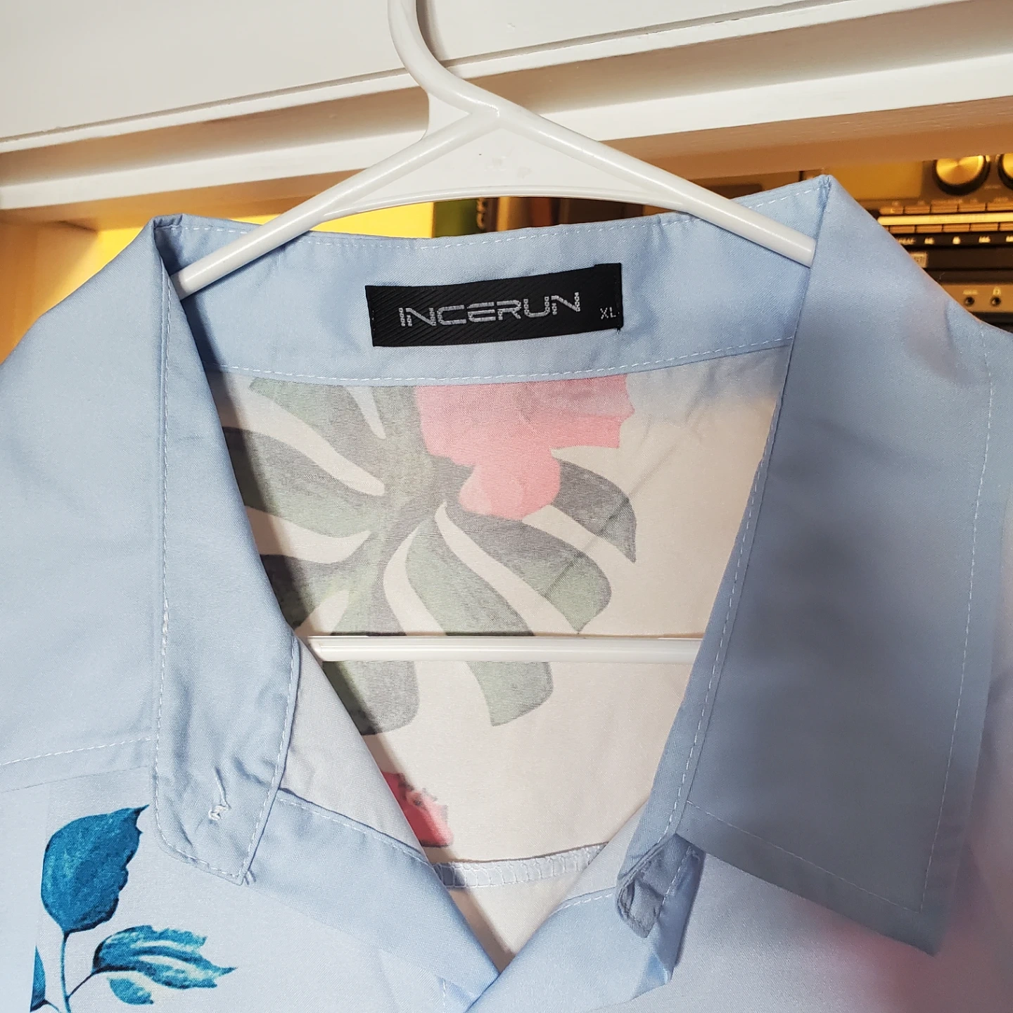 18Selling a fun INCERUN shirt with a floral and parrot print! It's a size XL and features a light blue color. The shirt has a short-sleeve design and is perfect for adding a pop of color to your wardrobe