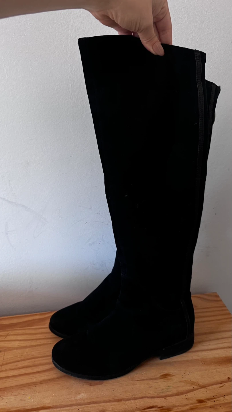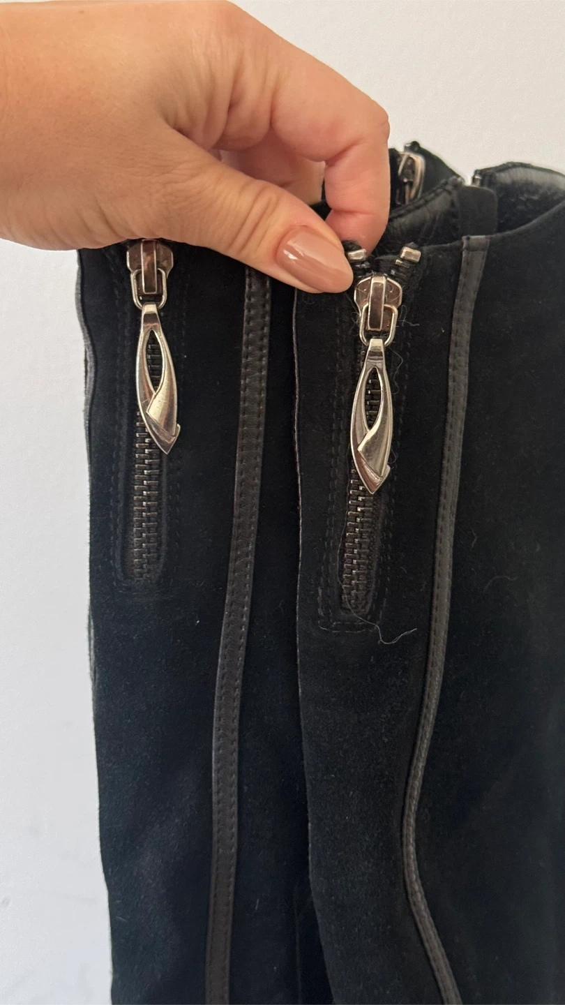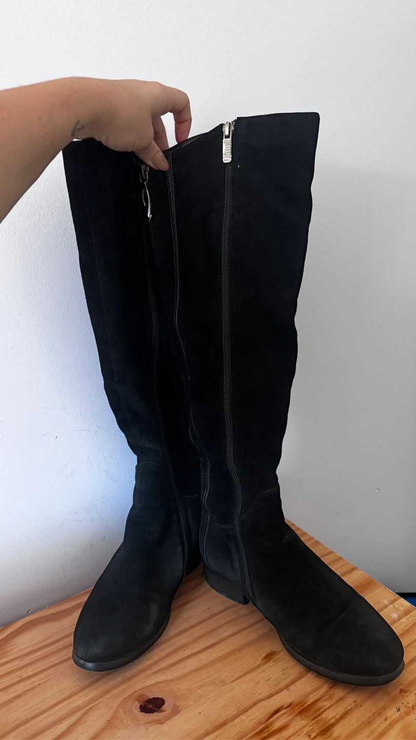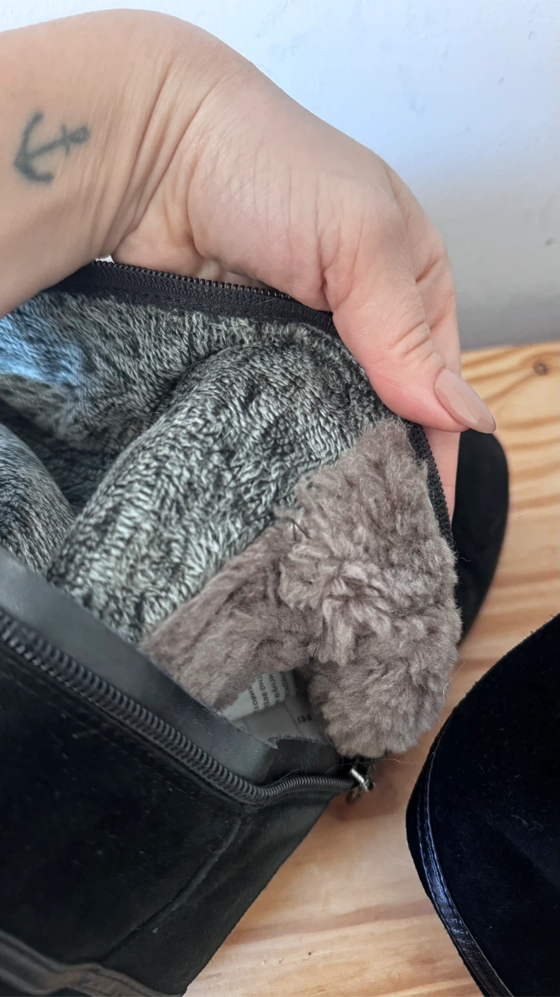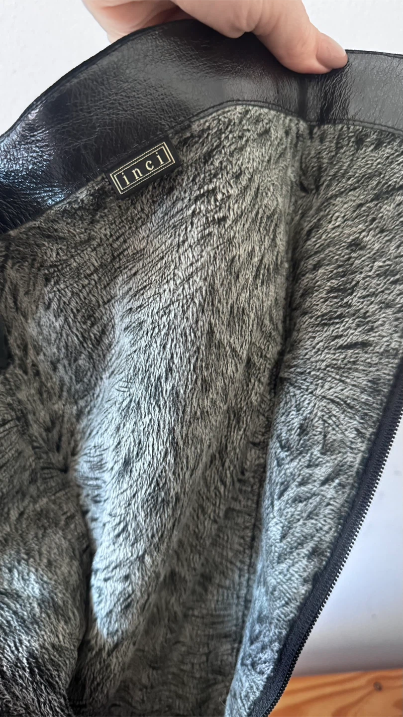 10Selling a pair of Inci knee-high boots in natural black suede. They feature a zipper closure and are lined for extra warmth and comfort — great for the colder months! The lining has shorter fur along the shins and longer fur around the feet.