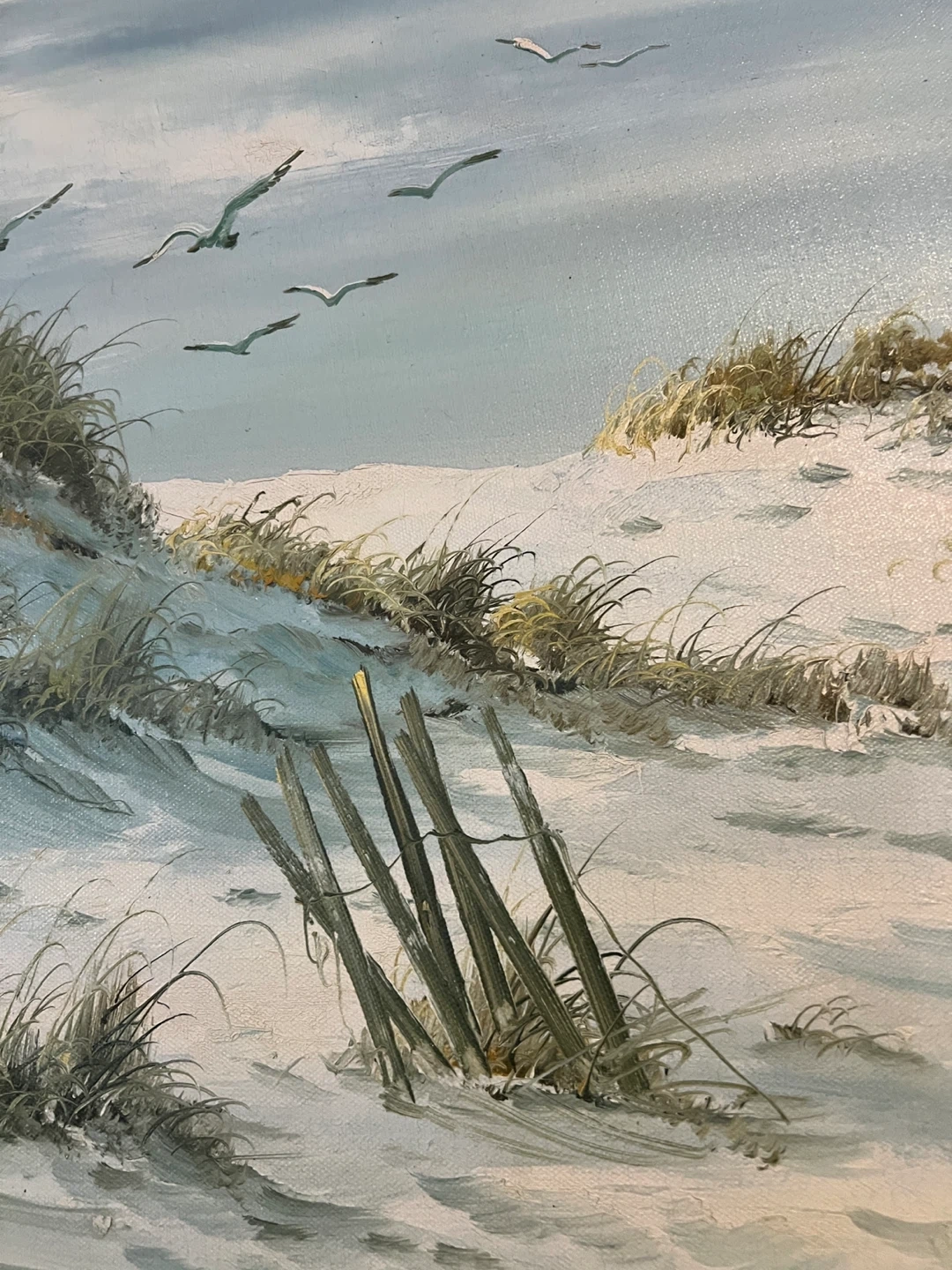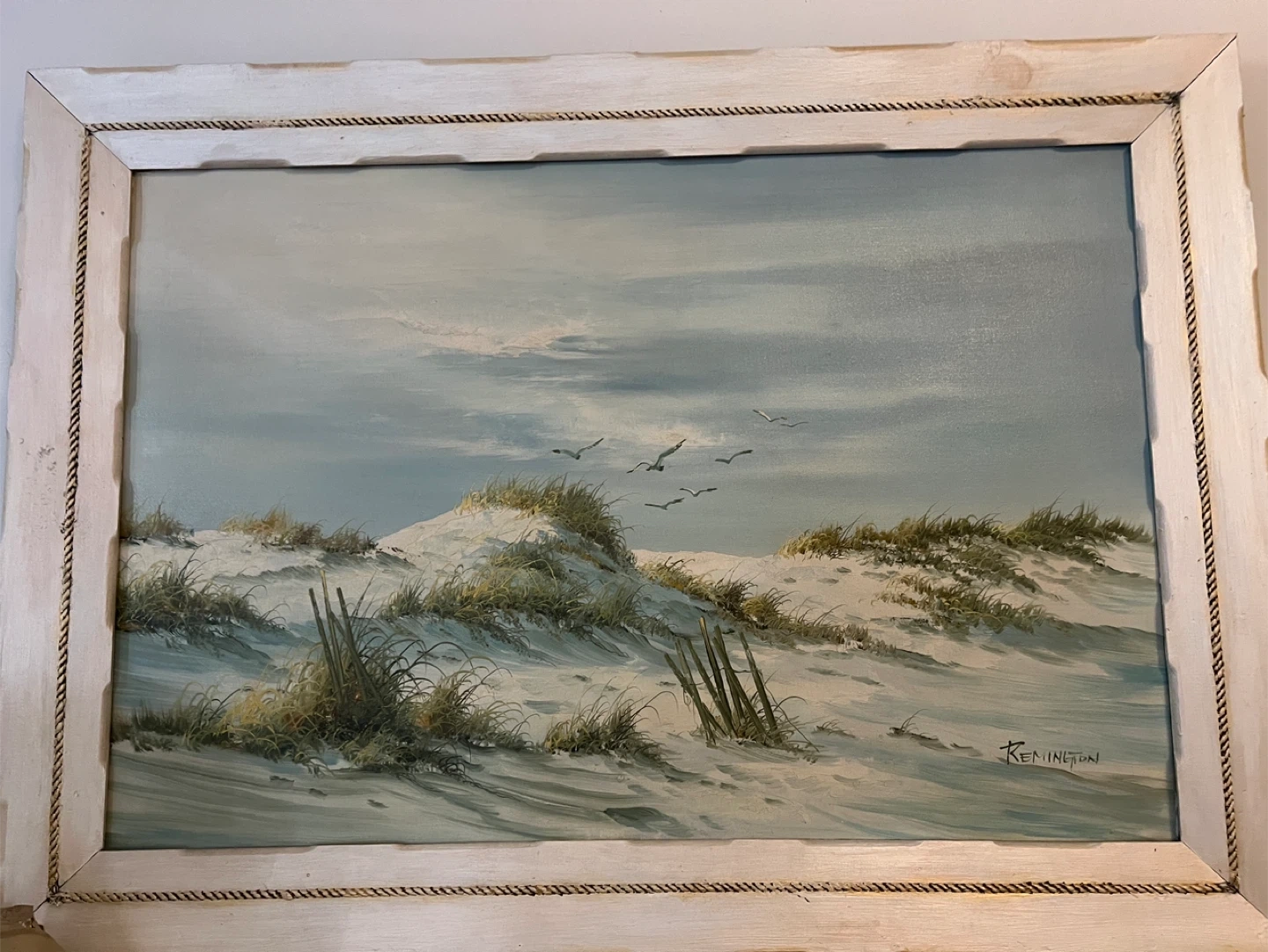 This is a huge 42” by 30” painting of a beach landscape with sand dunes and seagulls. It's signed by Remington. Oil on canvas
