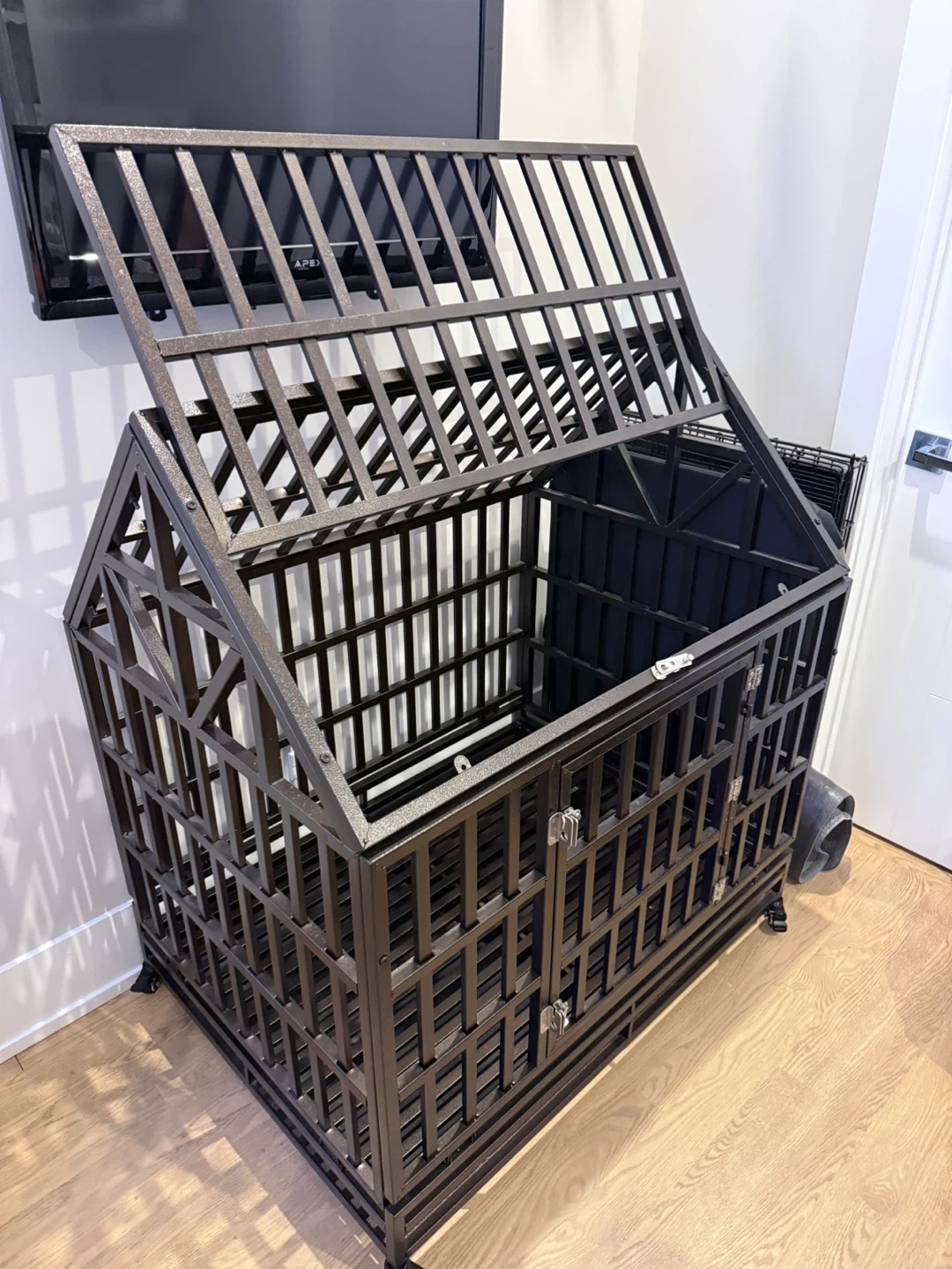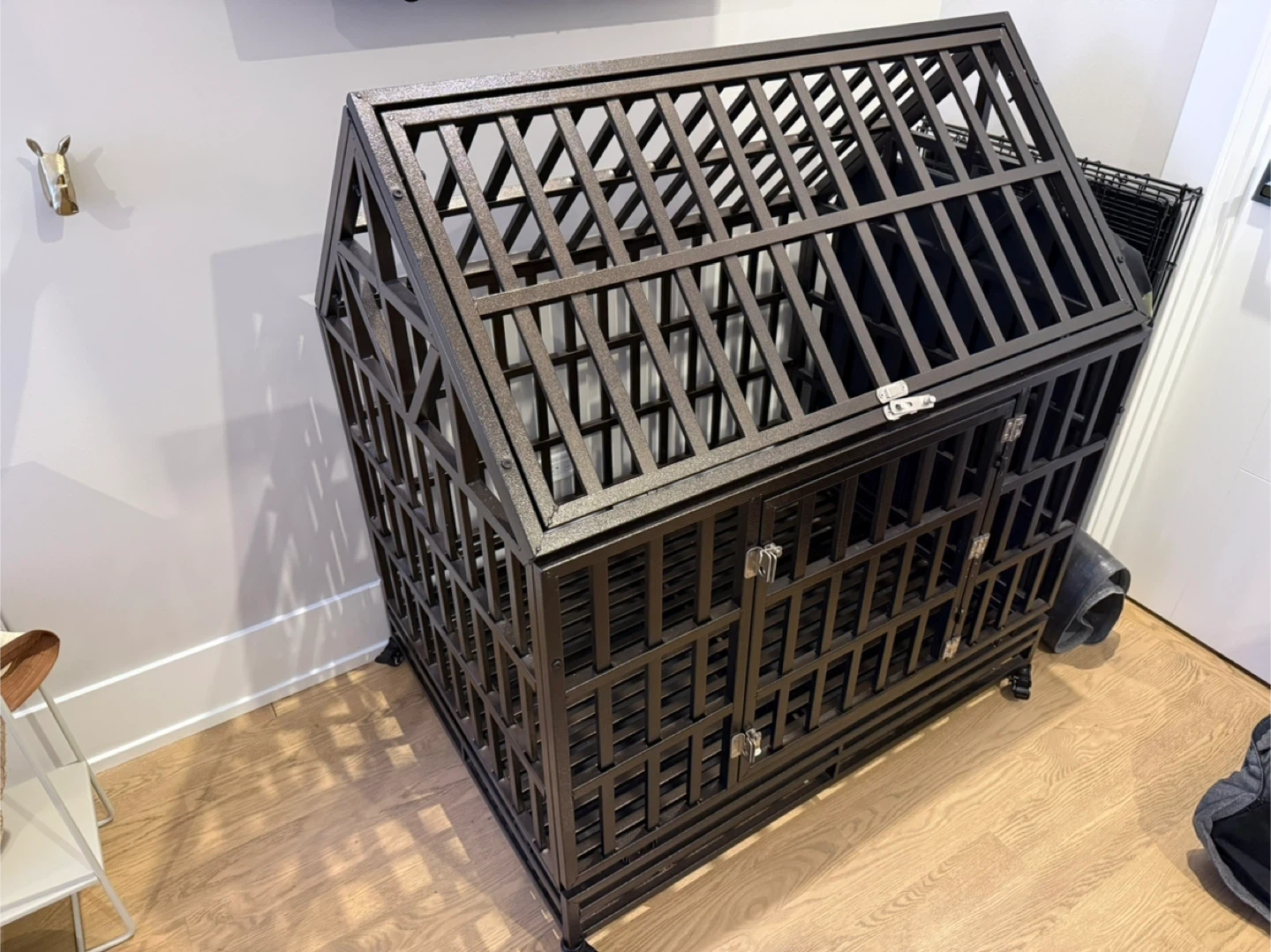 60Selling a sturdy metal dog crate. It's in great condition and ready for a new home for your furry friend! It's a house-shaped crate with heavy duty fittings 40 (l) x 30 (w) x 48 (h)