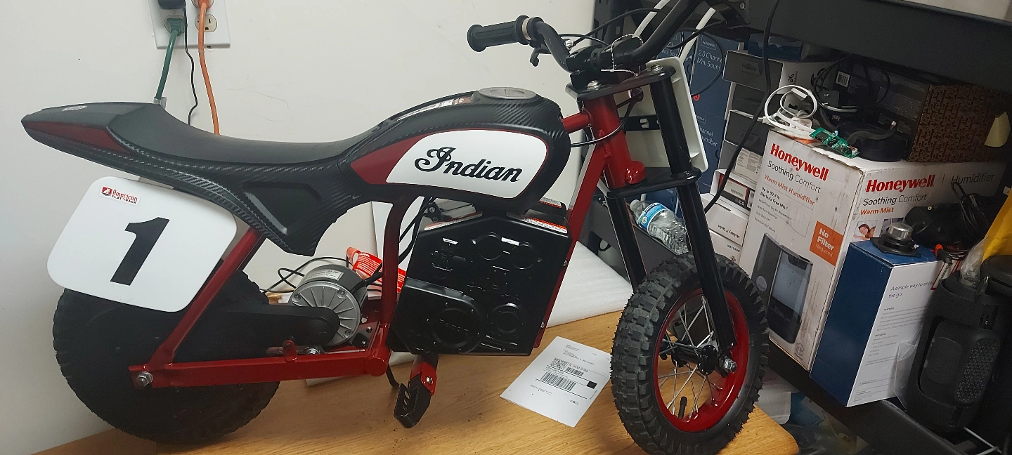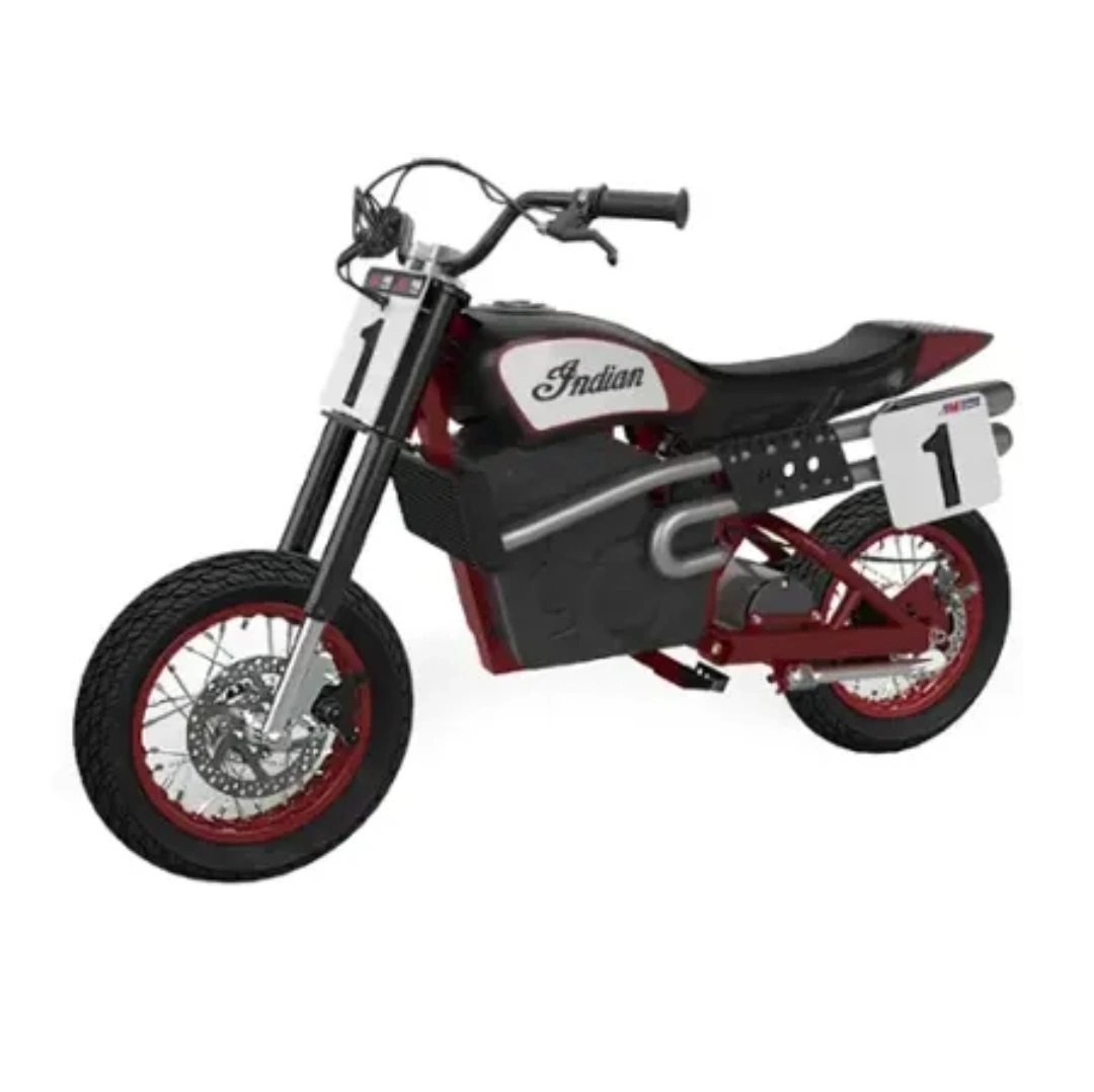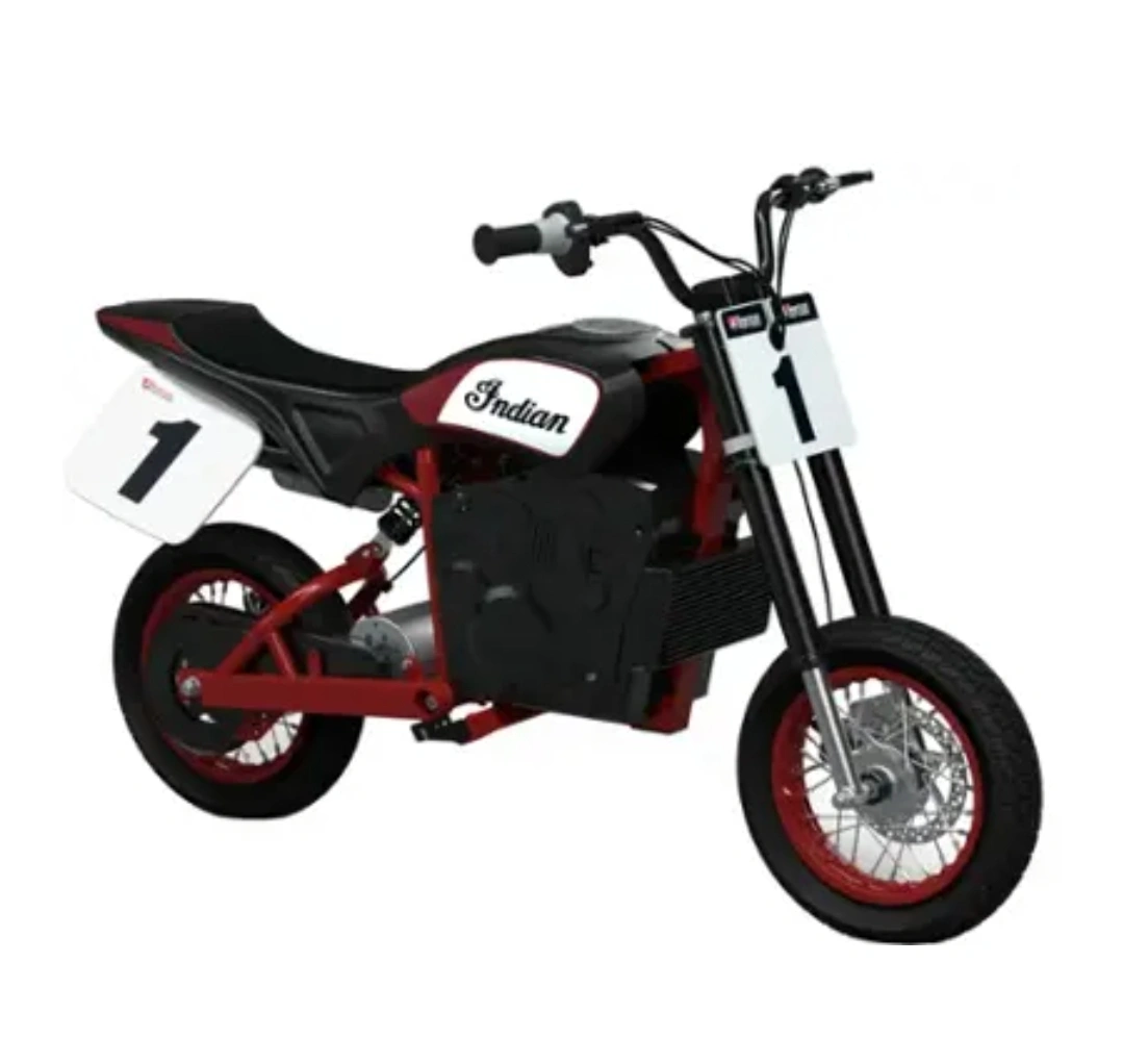 65Razor Indian Youth eFTR Jr w/7 miles Max Operating Range & 15 mph Max Speed - Small - Black Kids electric dirt bike. Red and black. Number 1 decals. Looks like new. Great condition. Like New With WARRANTY Easy Financing available