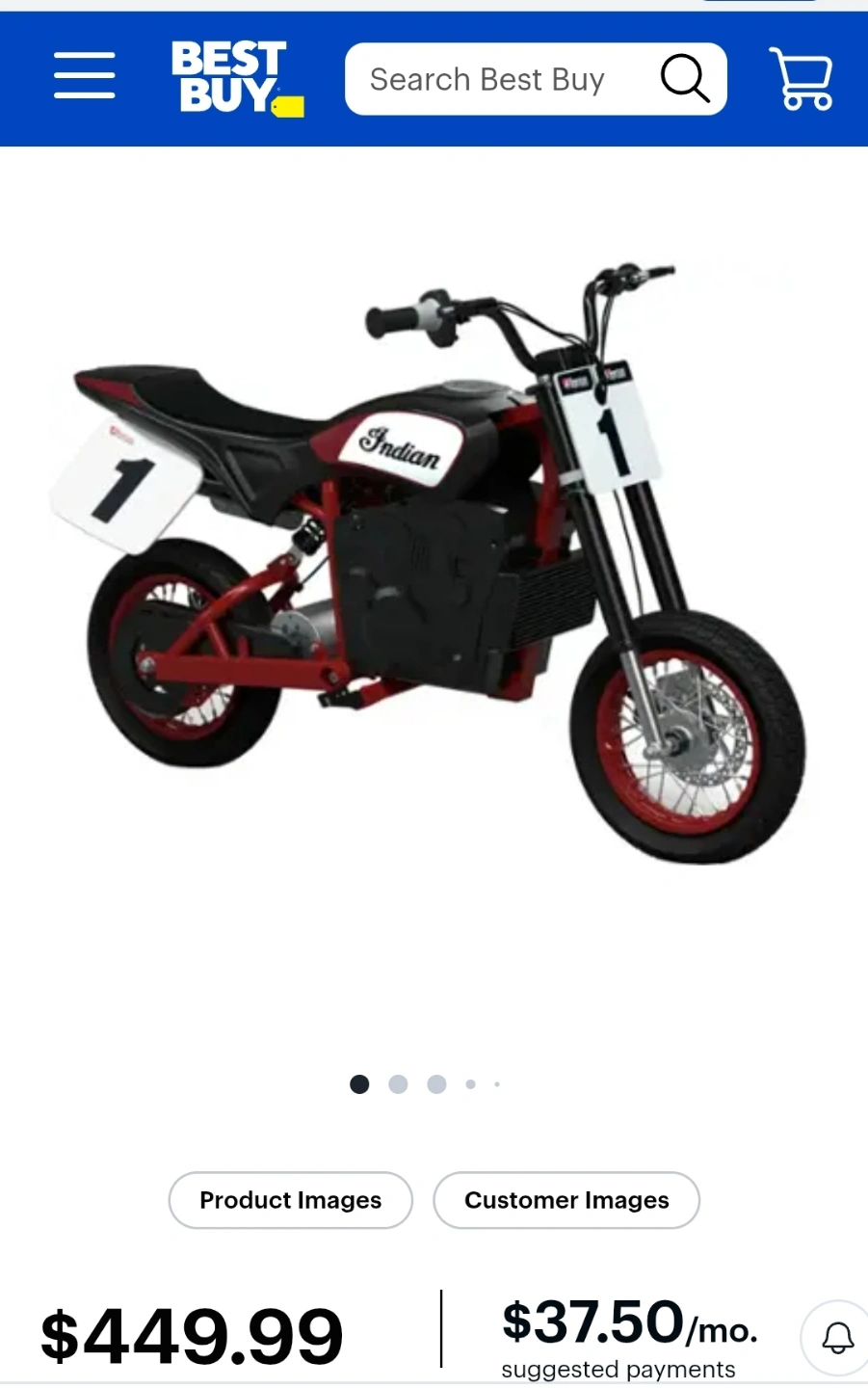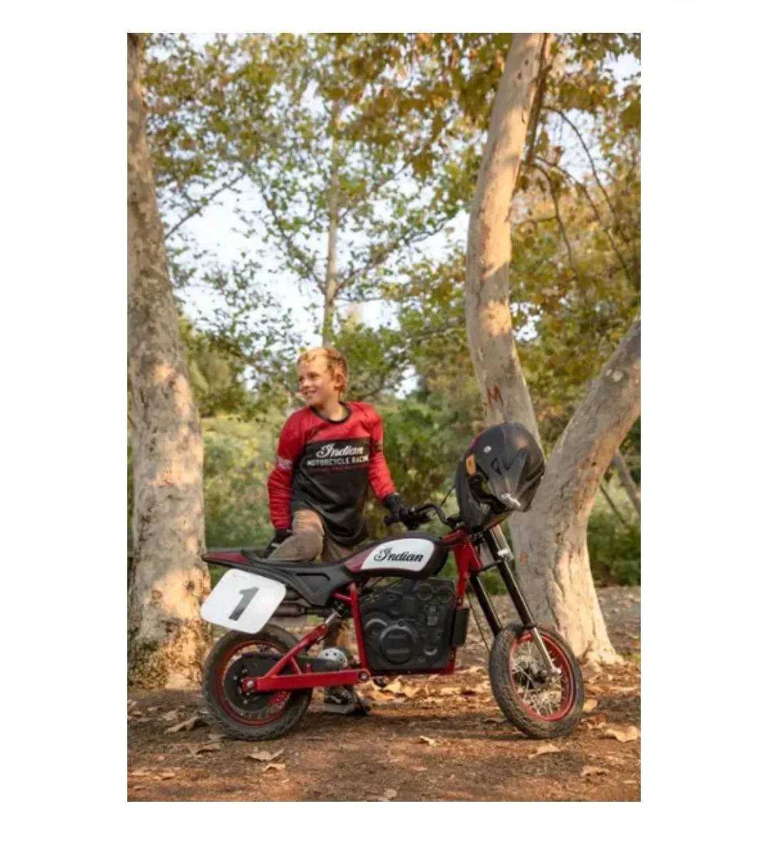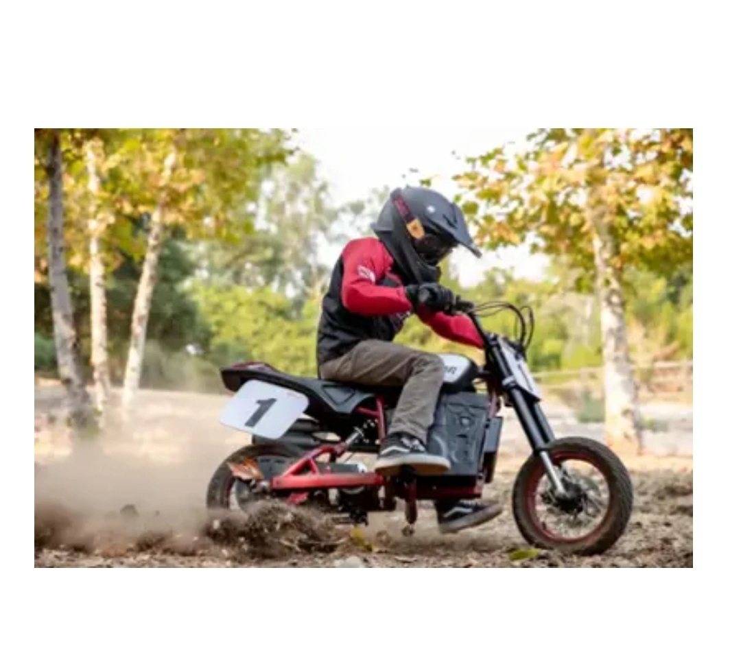 65Razor Indian Youth eFTR Jr w/7 miles Max Operating Range & 15 mph Max Speed - Small - Black Kids electric dirt bike. Red and black. Number 1 decals. Looks like new. Great condition. Like New With WARRANTY Easy Financing available