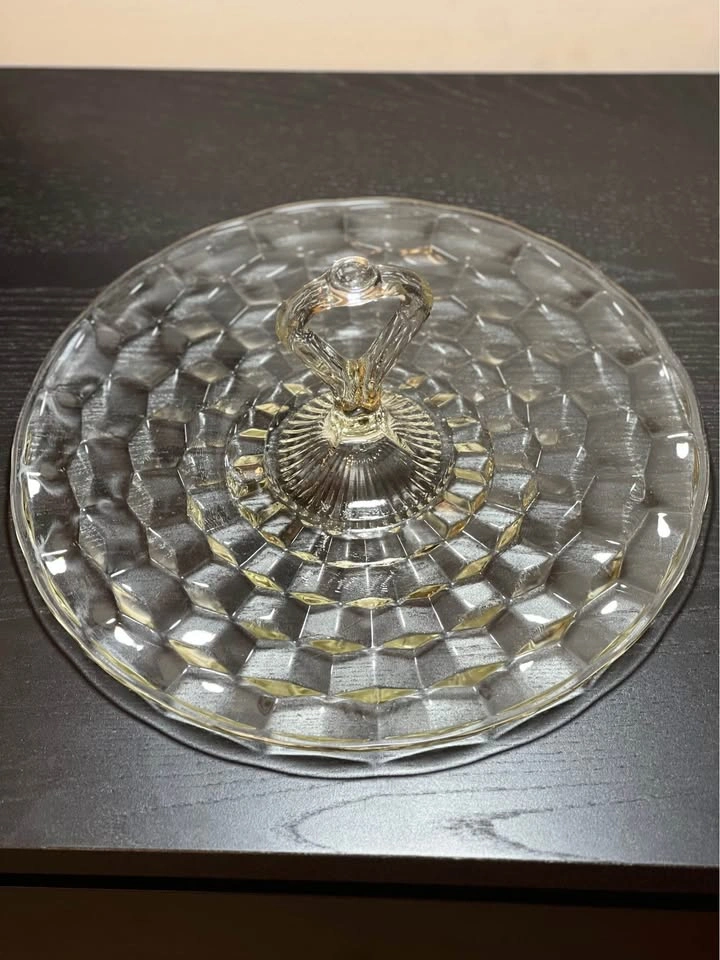 98Vintage Indiana Whitehall Colony Cubist Center Handled 13" Clear Sandwich Tray. Great for sandwiches or snacks. Clear with a cubist geometric design. Center handled. 13" Wide x 5" High. Small water stain as shown in photos.