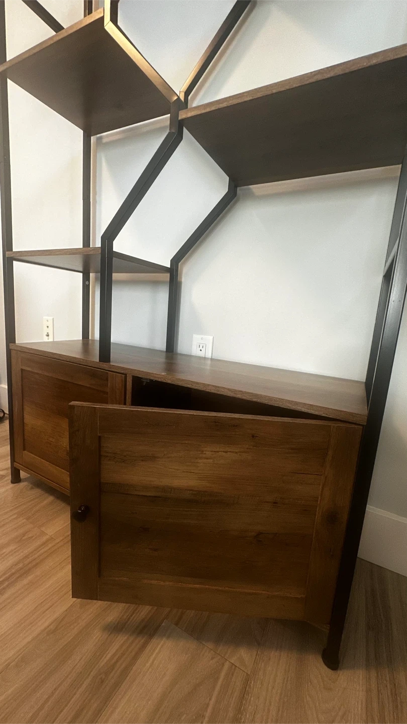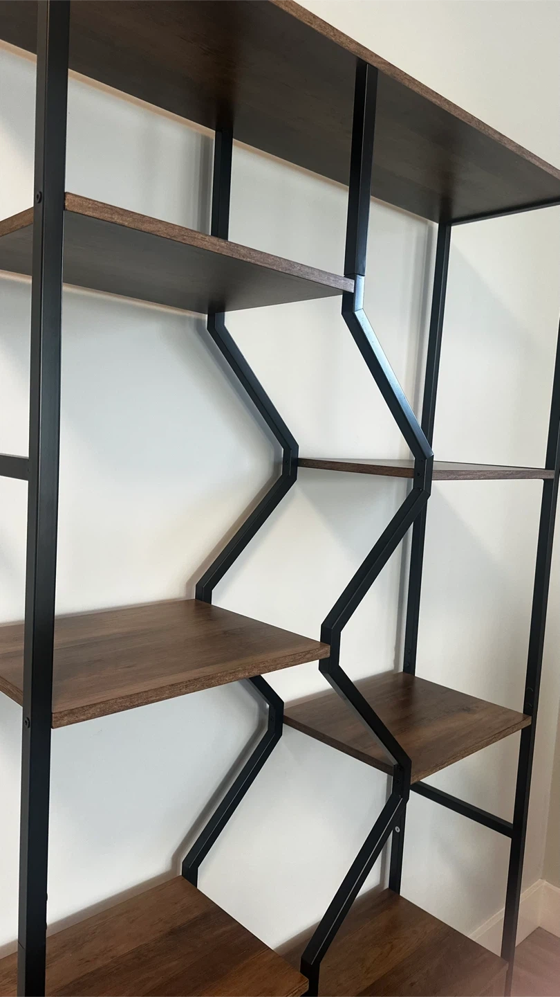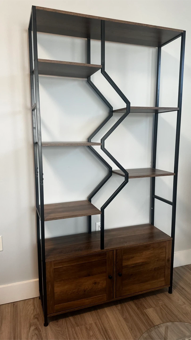 This industrial-style bookshelf features a sturdy black metal frame and wooden shelves with a storage cabinet at the bottom. It's perfect for adding a touch of modern style to your living room, bedroom, or office. The bookshelf provides ample space for books, plants, and other decorative items.