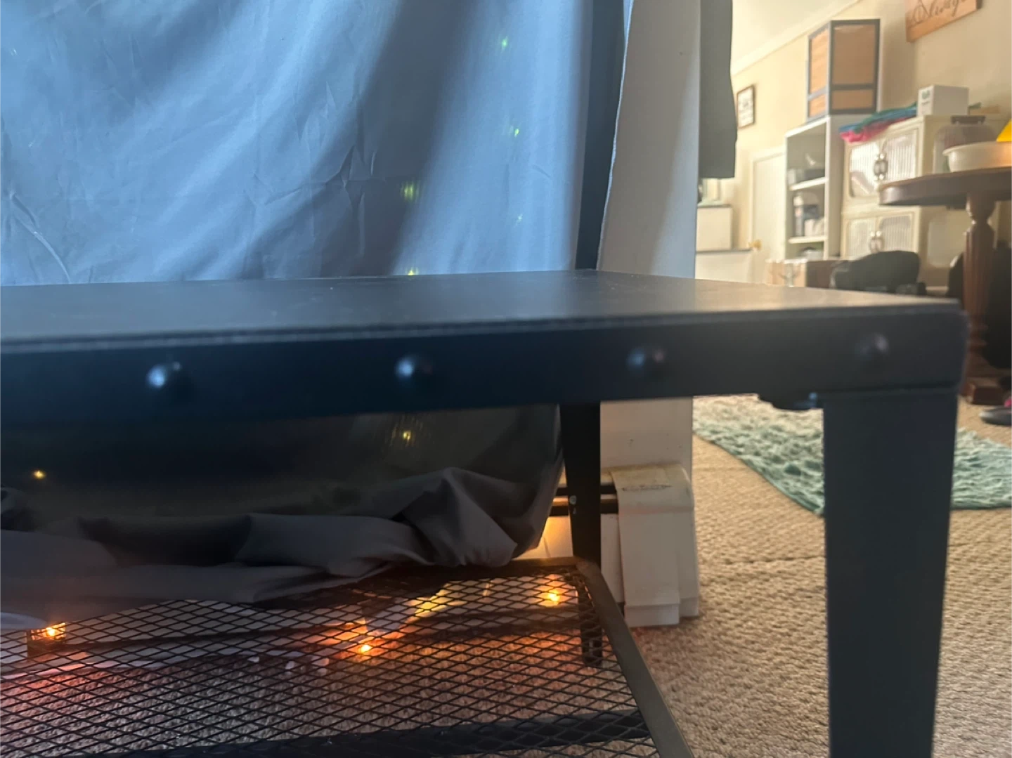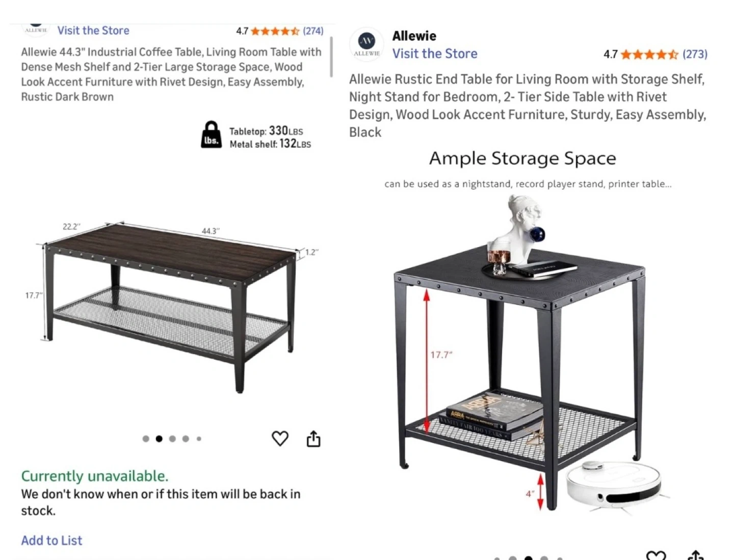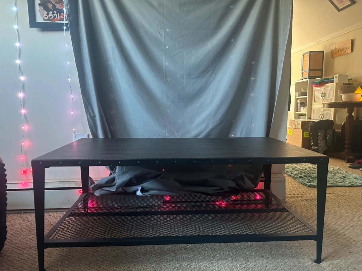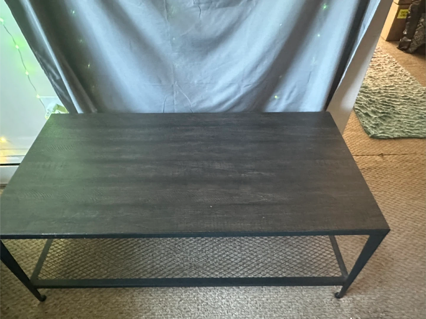 6544"x22" industrial style wood facade top coffee table (17" high) with matching side tables (only one pictured both included) (18" square, 28" high). There are some signs of wear on one side table, but otherwise looks great after being cleaned. Just downsizing! Natural 1.2 inches extra thick wood top has a vintage and rustic industrial appearance that adds fashionable, minimalistic style to any living room setup. A mesh shelf supports up to 132 lbs, and 4 adjustable feet keep it level. Made of durable MDF wood with a solid metal frame, this robust table withstands up to 330 lbs. Color: Black. Material: Metal, Particle board. Looking to move it out quick so make a fair offer! MORE PICTURES AVAILABLE UPON REQUEST