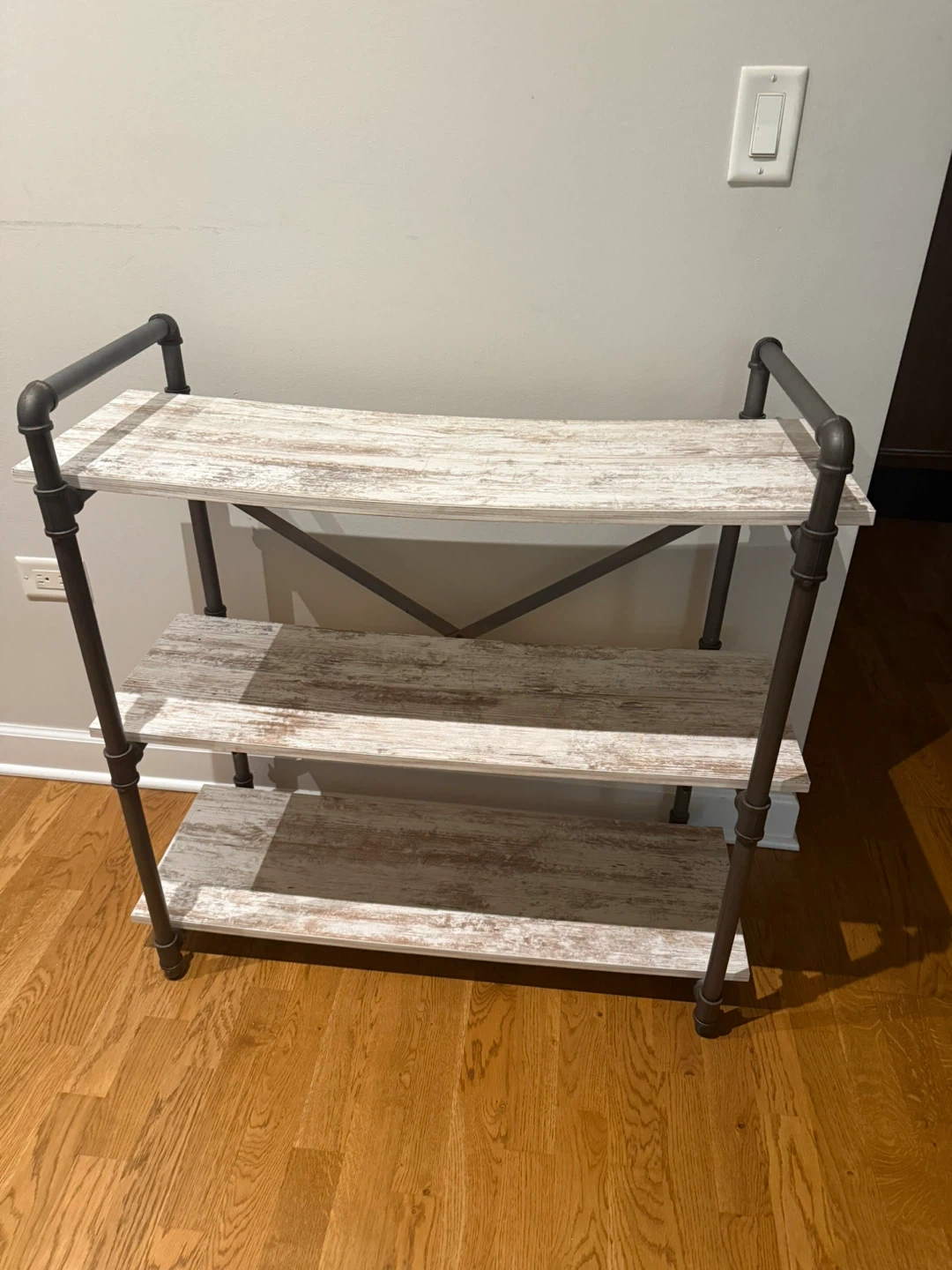 26This is a cool industrial-style shelf with three tiers. It's perfect for adding some rustic charm to your space! The shelves have a whitewashed wood look, and the frame is a dark metal. It's sturdy and in great condition, ready to hold your books, plants, or anything else you want to display