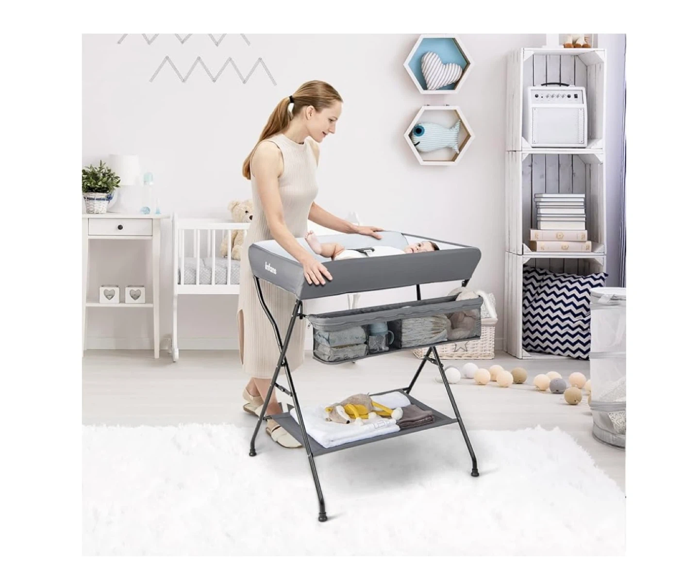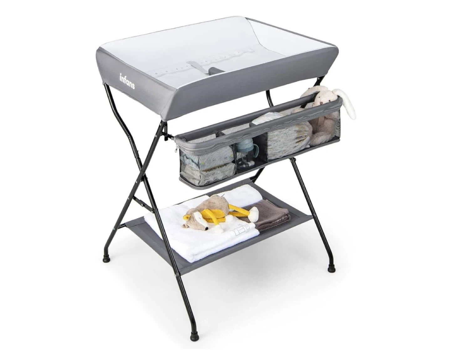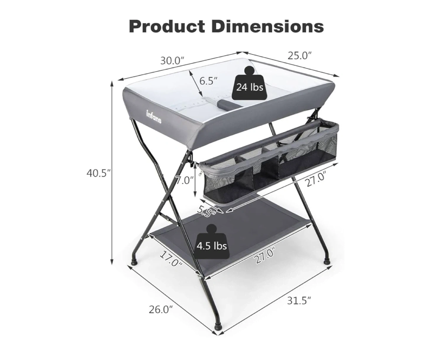 This is an Infans folding baby changing table. It has a convenient design for easy storage and portability. The product dimensions are approximately 30" x 25" x 40.5". It also includes a storage basket and a lower shelf for keeping baby essentials handy. gently used and still in original box.