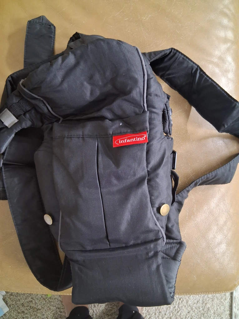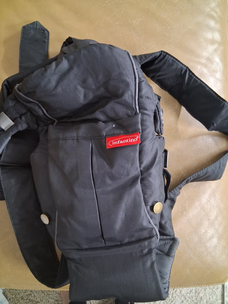 I'm selling an Infantino baby carrier! It's in great condition and ready for a new little one. This carrier is perfect for keeping your baby close and comfortable while you're on the go. It's designed for convenience and ease of use, making it a must-have for parents