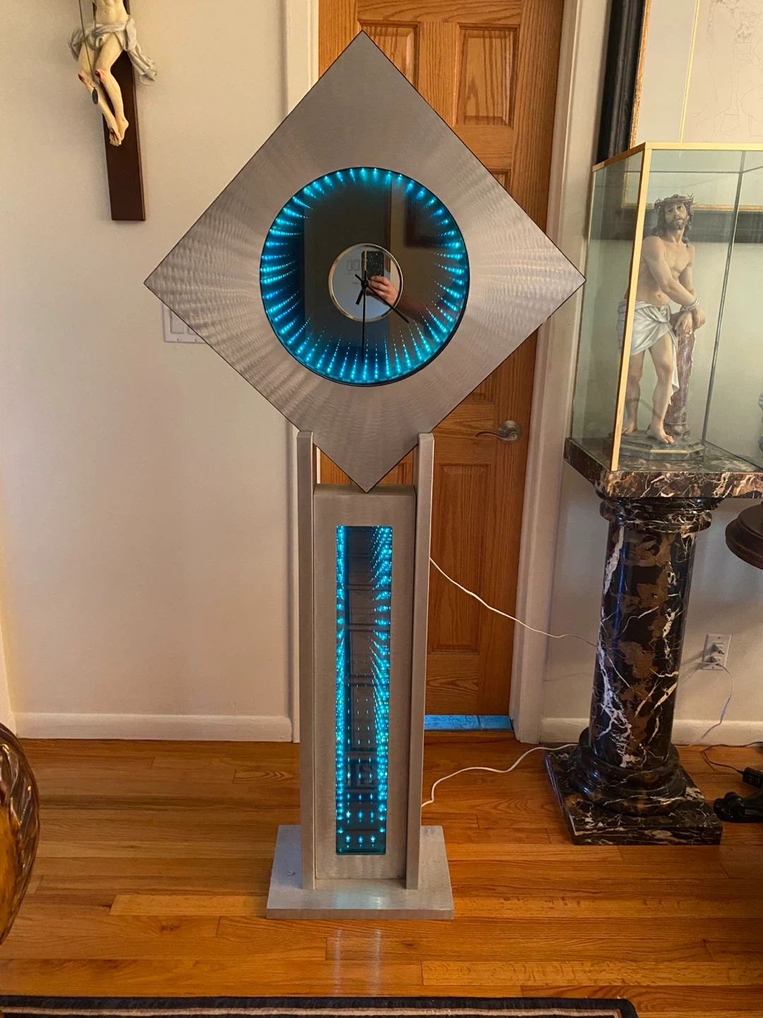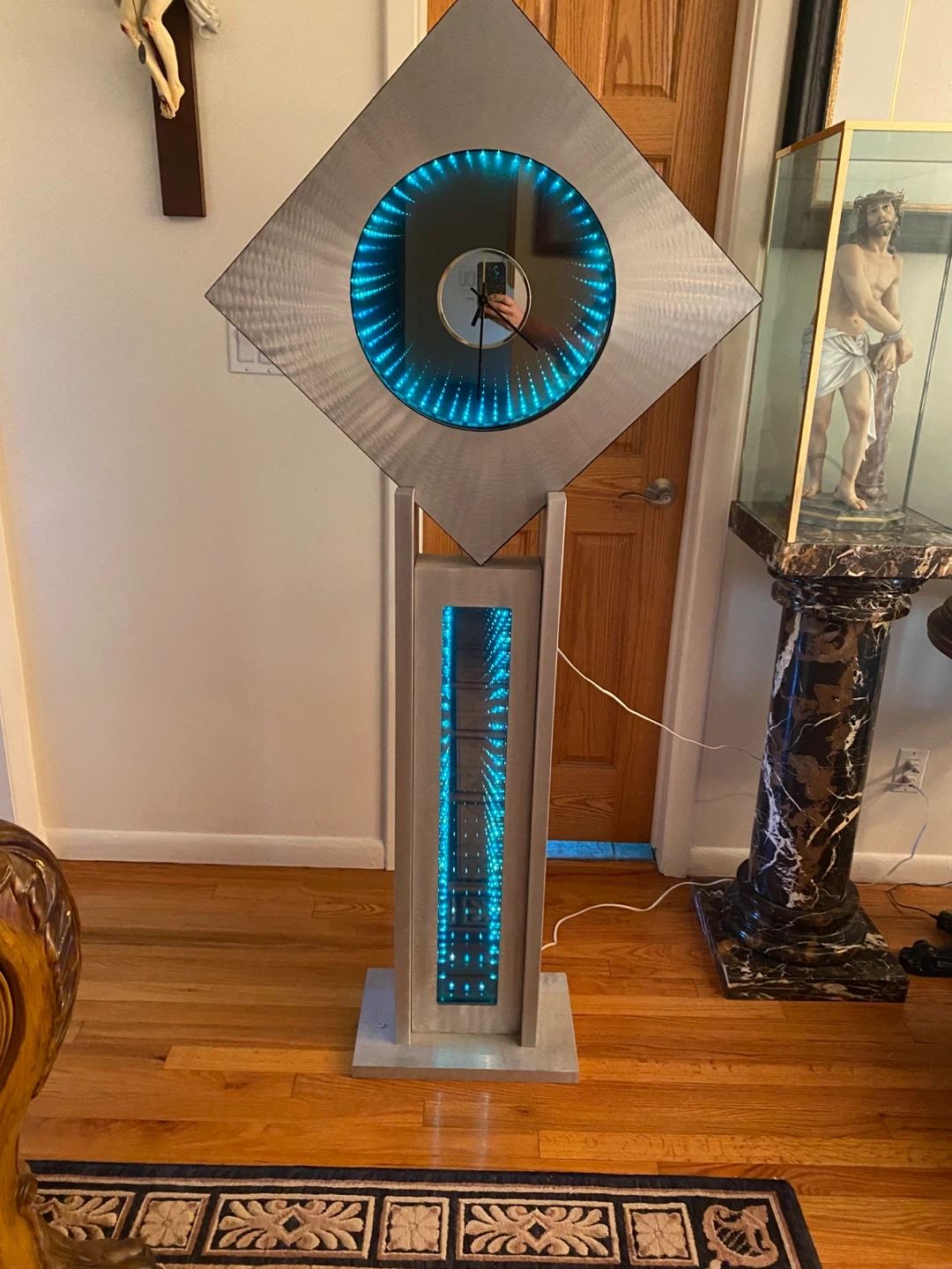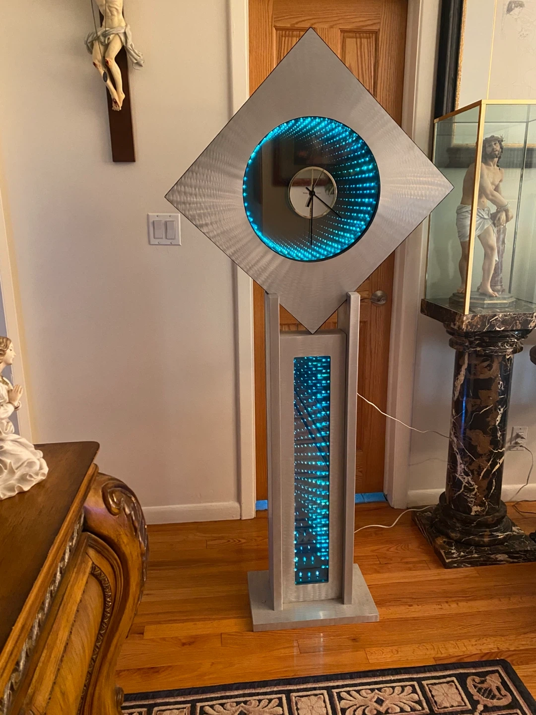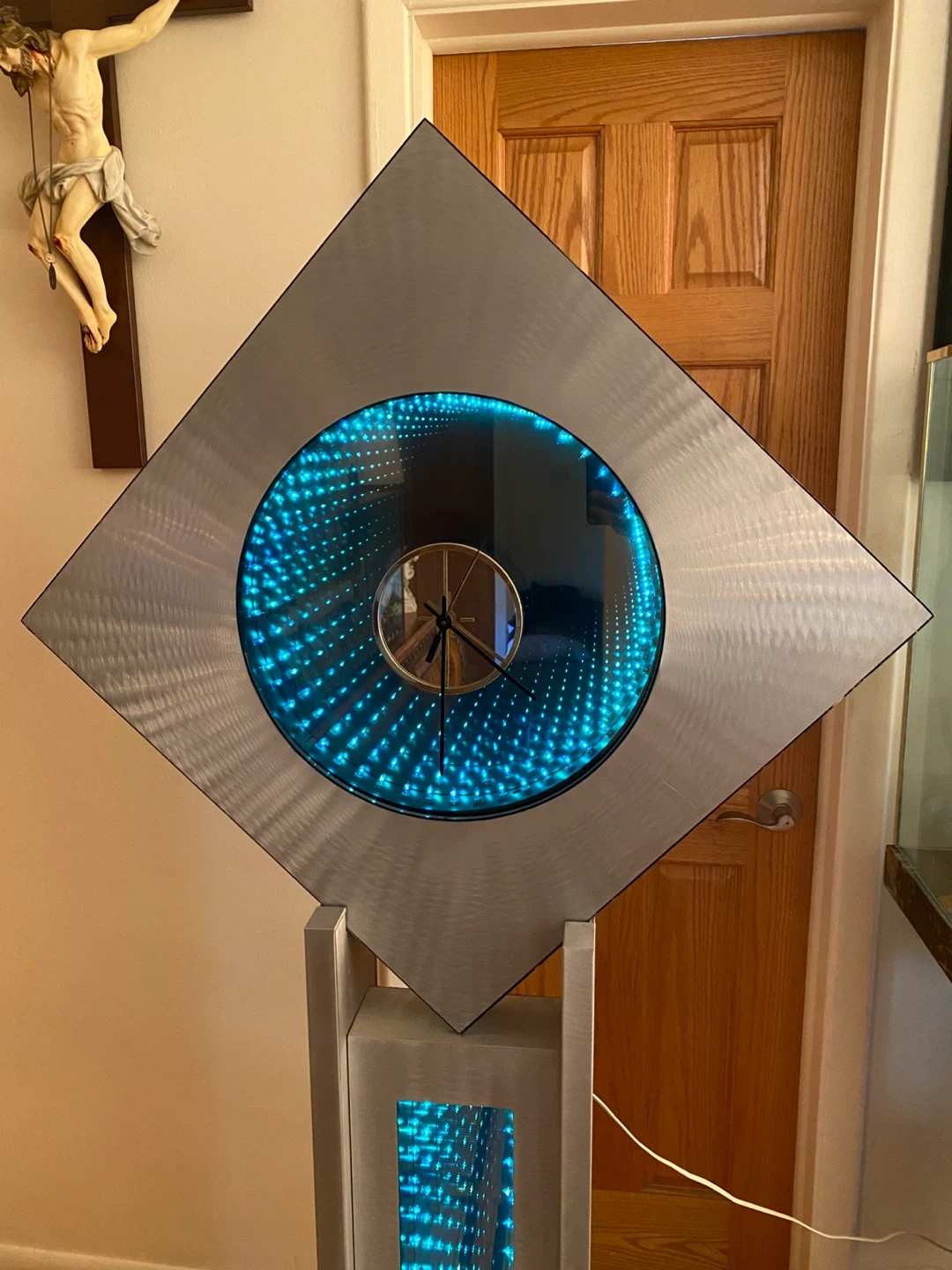 Selling a unique infinity floor clock. It features a modern design with a diamond-shaped clock face and a rectangular base. The clock has an infinity mirror effect created by blue LED lights, giving it a cool, futuristic look. It's a great statement piece for any room!