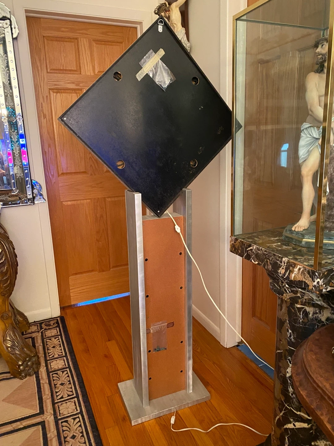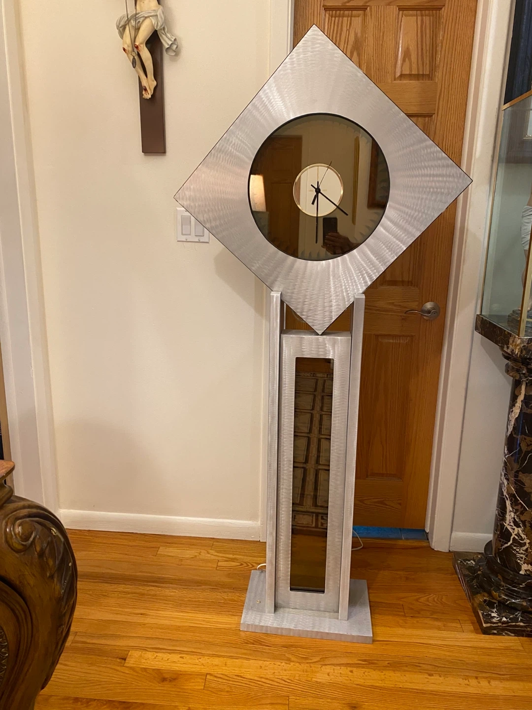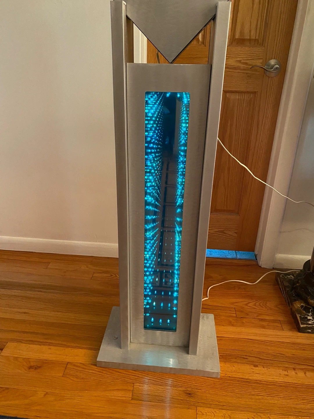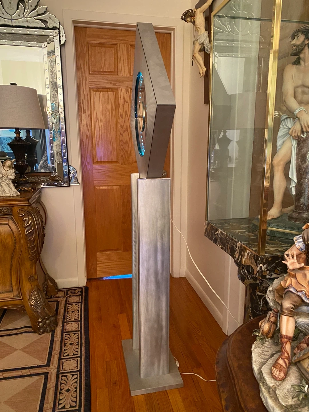 Selling a unique infinity floor clock. It features a modern design with a diamond-shaped clock face and a rectangular base. The clock has an infinity mirror effect created by blue LED lights, giving it a cool, futuristic look. It's a great statement piece for any room!