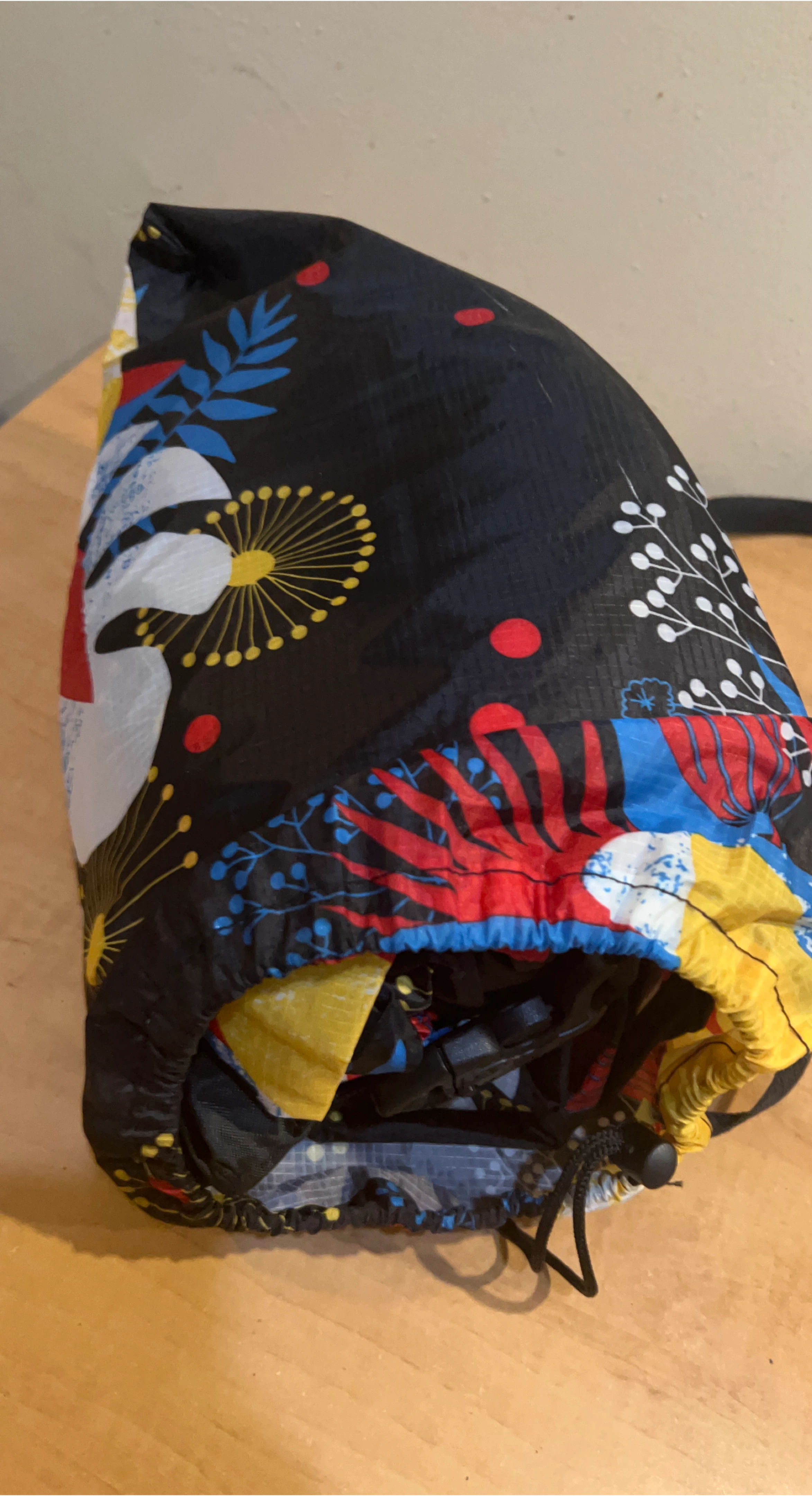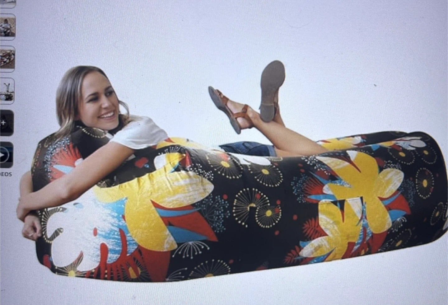 This is a fun inflatable lounger, perfect for relaxing outdoors. It features a colorful floral design on a black background. It's lightweight and easy to inflate, making it great for travel or camping. Enjoy lounging in style! Used maybe twice. Lots of running to make it actually look like lounger.