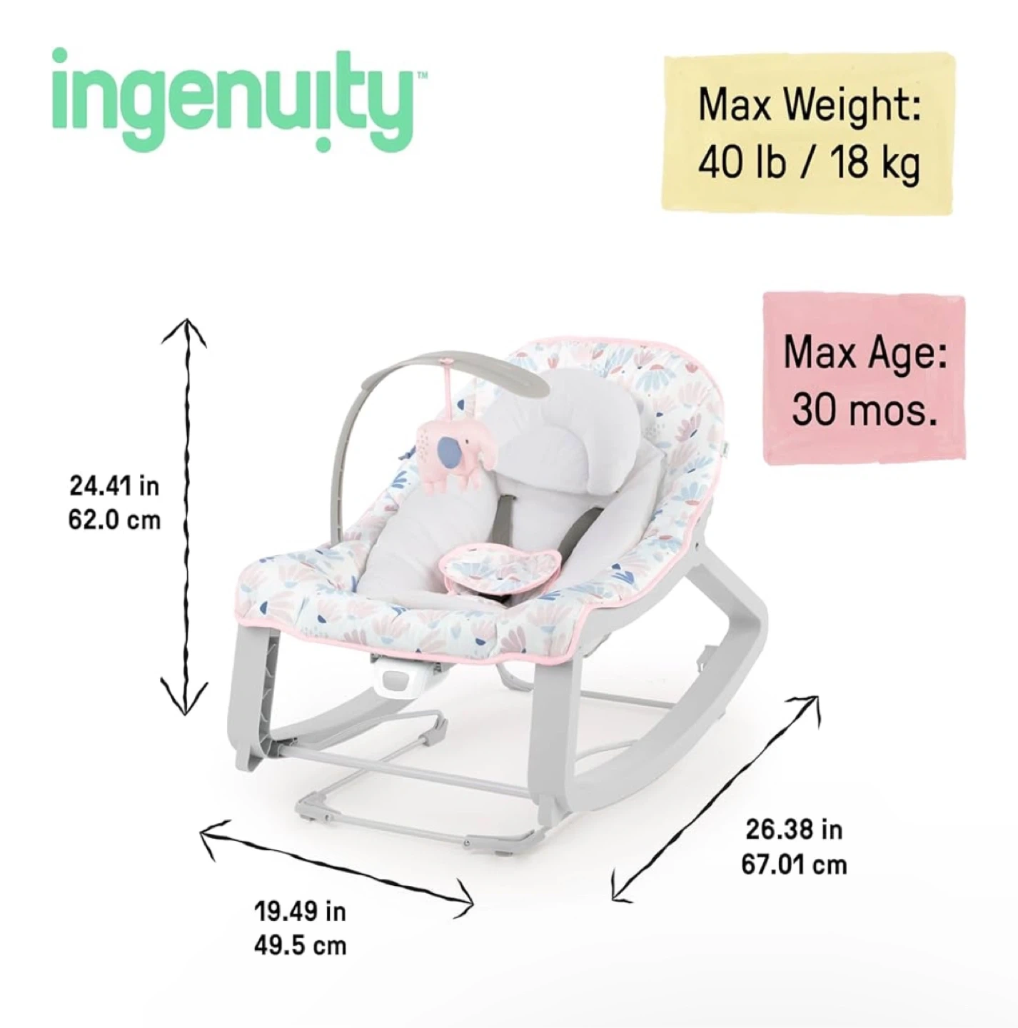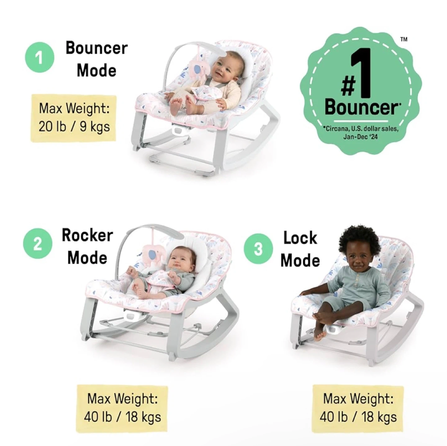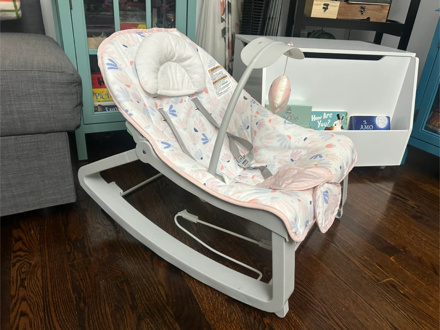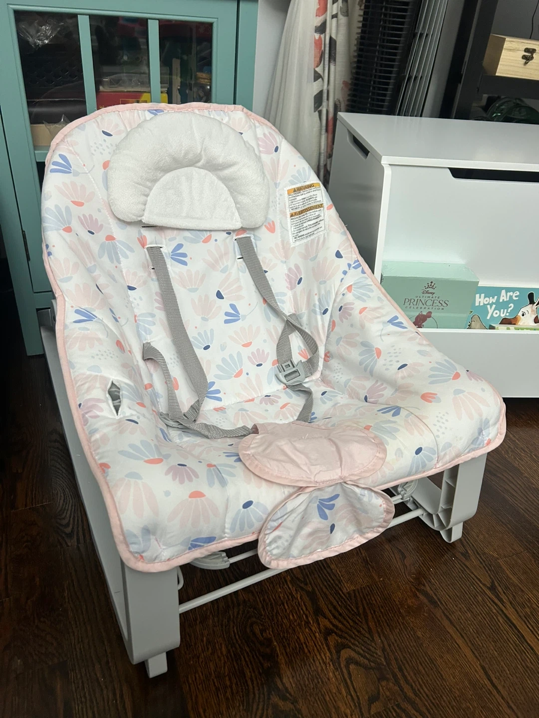 10Reason for selling: I have an extra one. My baby loved and continues to love this bouncy/rocking chair. What I love the most is that it grows with your baby. It can be use from birth to 30months of age, or 40lbs (whatever comes first). This chair can rock, bounce or lock in place and the backrest has 2 reclining position. This chair includes a removable insert for newborns and a headrest, a elephant plushy toy for your baby’s entertainment, and a soothing vibration thingy. In addition, the lining is machine washable.