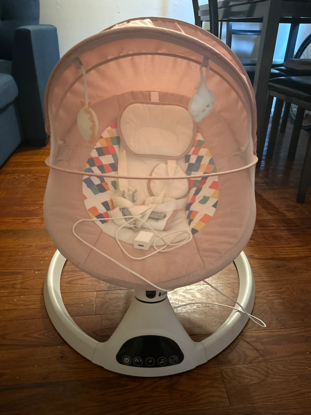 This is an Ingenuity ConvertMe Swing-2-Seat Portable Baby Swing. It's in great condition and ready for a new home. It easily converts from a swing to a stationary seat with soothing vibrations. The swing includes a mobile with plush toys to entertain your little one