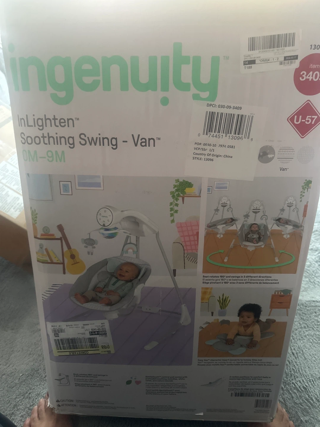 Selling an Ingenuity InLighten Soothing Swing in the Van design! It's suitable for babies from 0 to 9 months. The seat rotates 180° and swings in 3 different directions. Also, the Cozy Van character insert converts to a tummy time mat