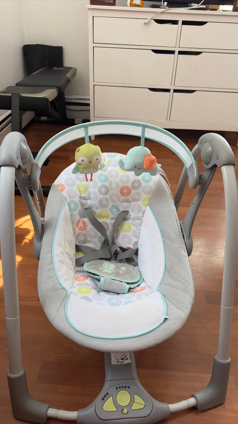 I'm selling an Ingenuity Swing 'n Go Portable Swing, suitable for babies from 0-9 months. It's in great condition and comes with the original box. It features a cute design with hanging toys to keep your little one entertained. SlimFold design for easy storage & transport