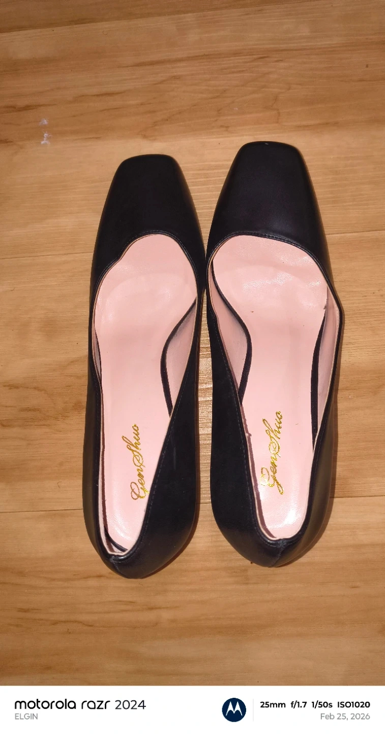 These black flats have a chic square toe design. The interior is lined with a soft pink material. They appear to be made of faux leather.