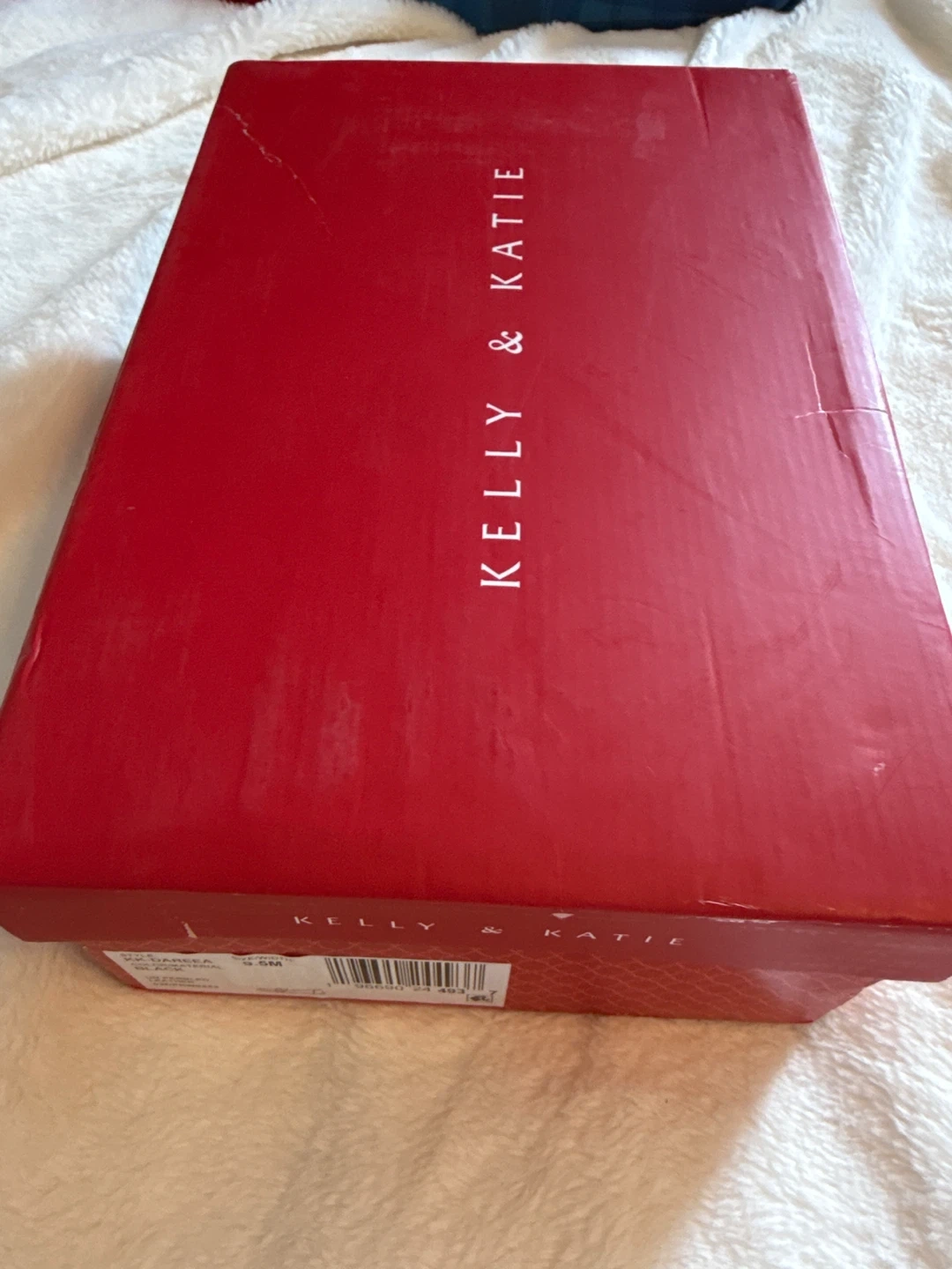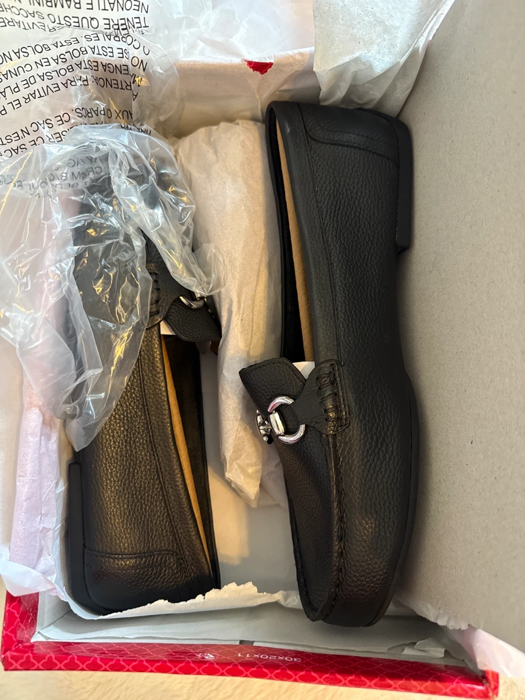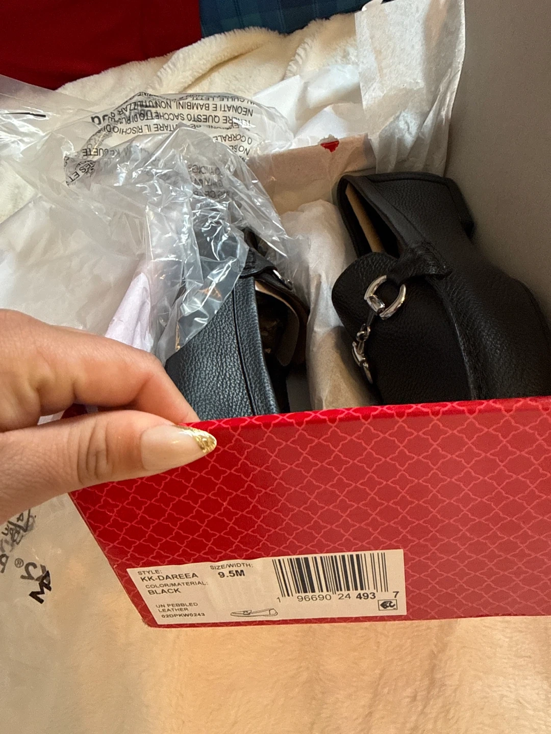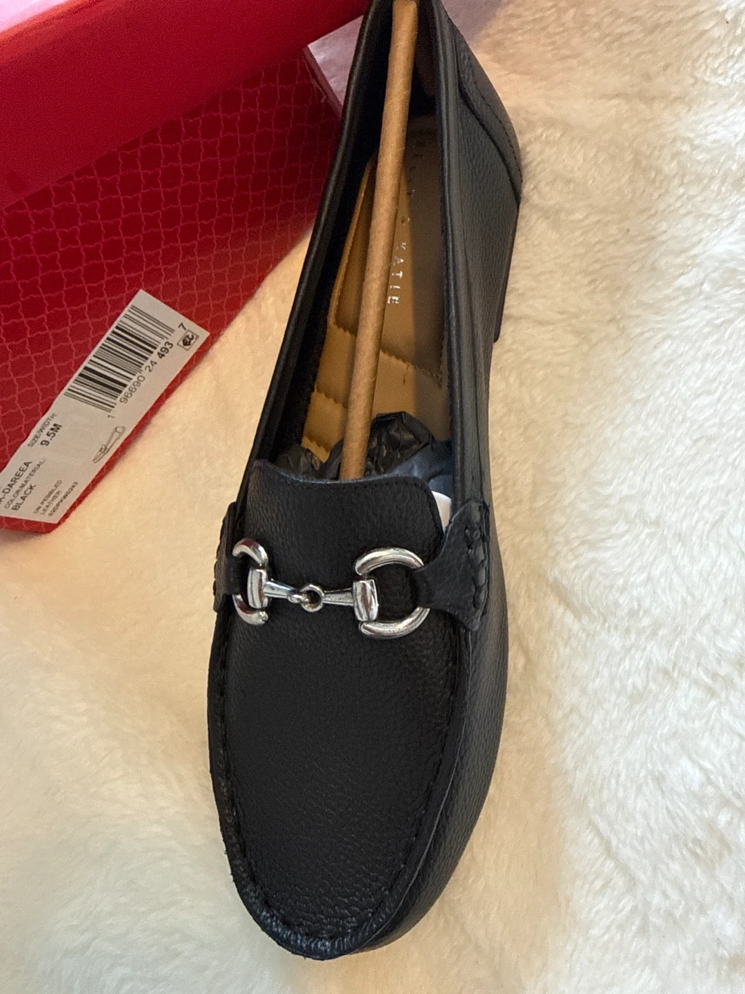 These are women's Kelly & Katie loafers. They're black with a pebble texture and a silver buckle accent. Size is 9.5 medium. Includes the original box!