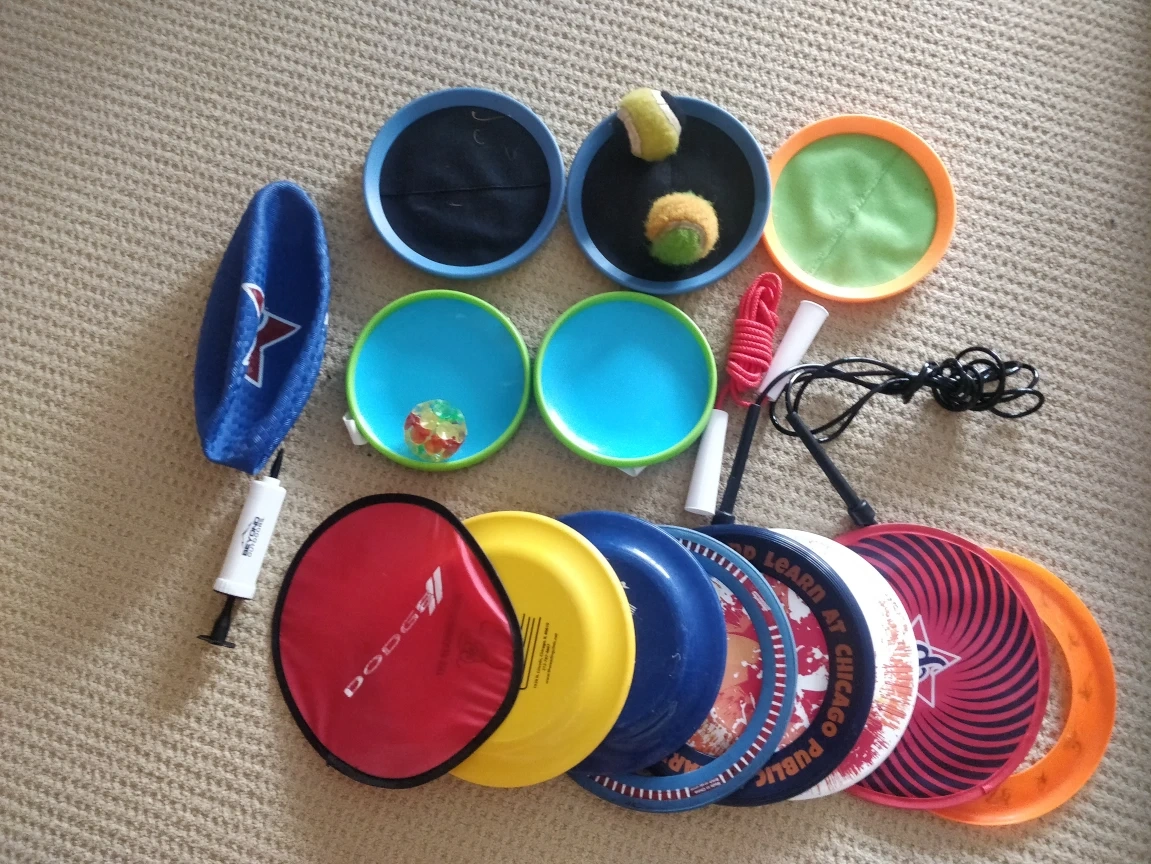 Fun outdoor games for kids. Includes several flying discs, frisbee. Catch and toss games with balls and targets. Jump rope. Perfect for active play.