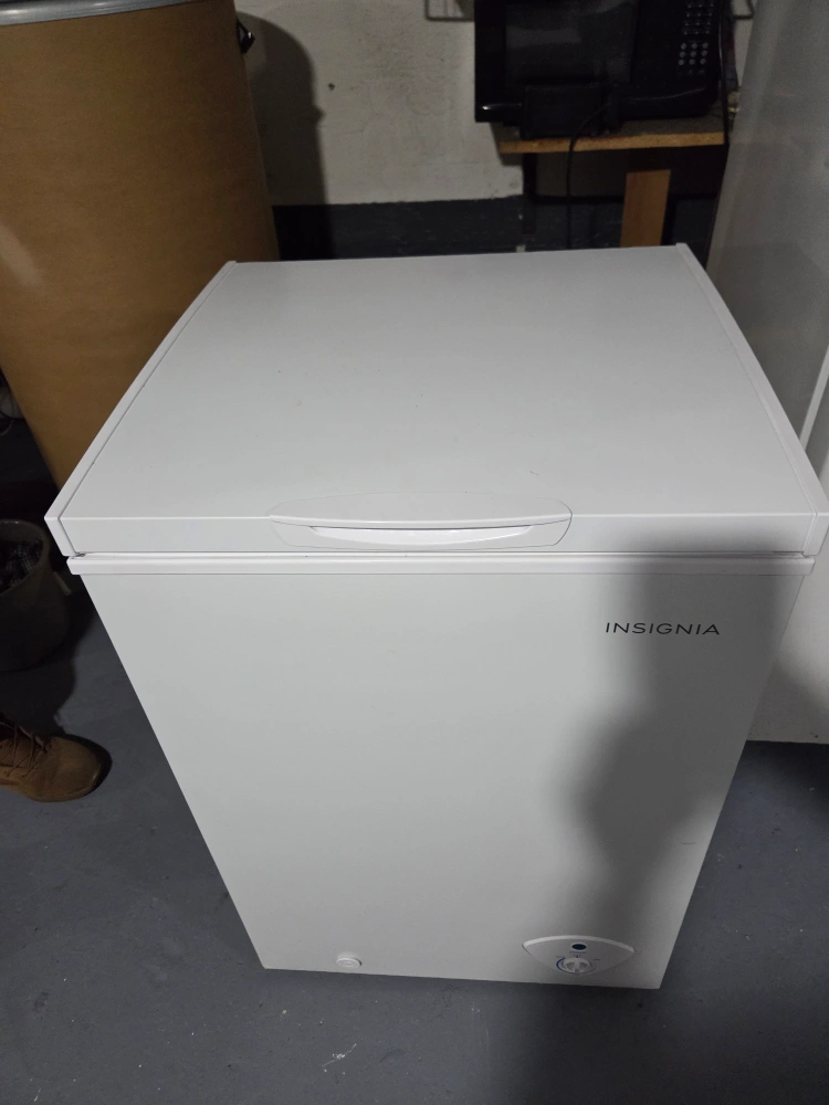 Selling an Insignia chest freezer in white. It's in good condition and ready to keep your food frozen!