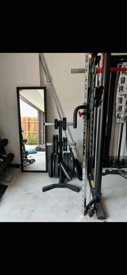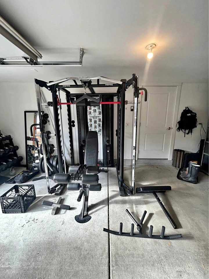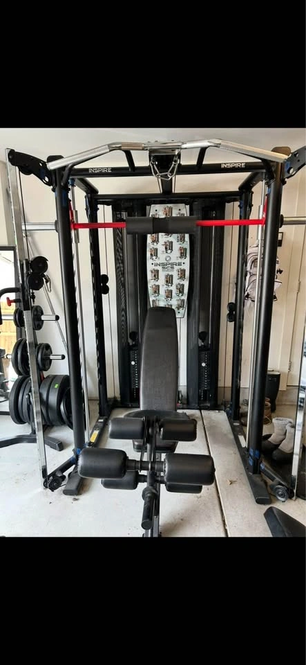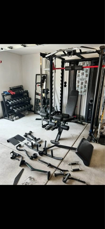 Full Inspire Fitness SCS Smith Cage System. Includes plated weights and additional attachments. Incline bench included Please note that you will have to hire someone to take this apart and set up. About two years old. Barely used. In excellent condition. Regular price sells for 6700 without additional weights and attachments. With attachments and additional weights goes for 7800. Dumbbells are not included and have been sold already.