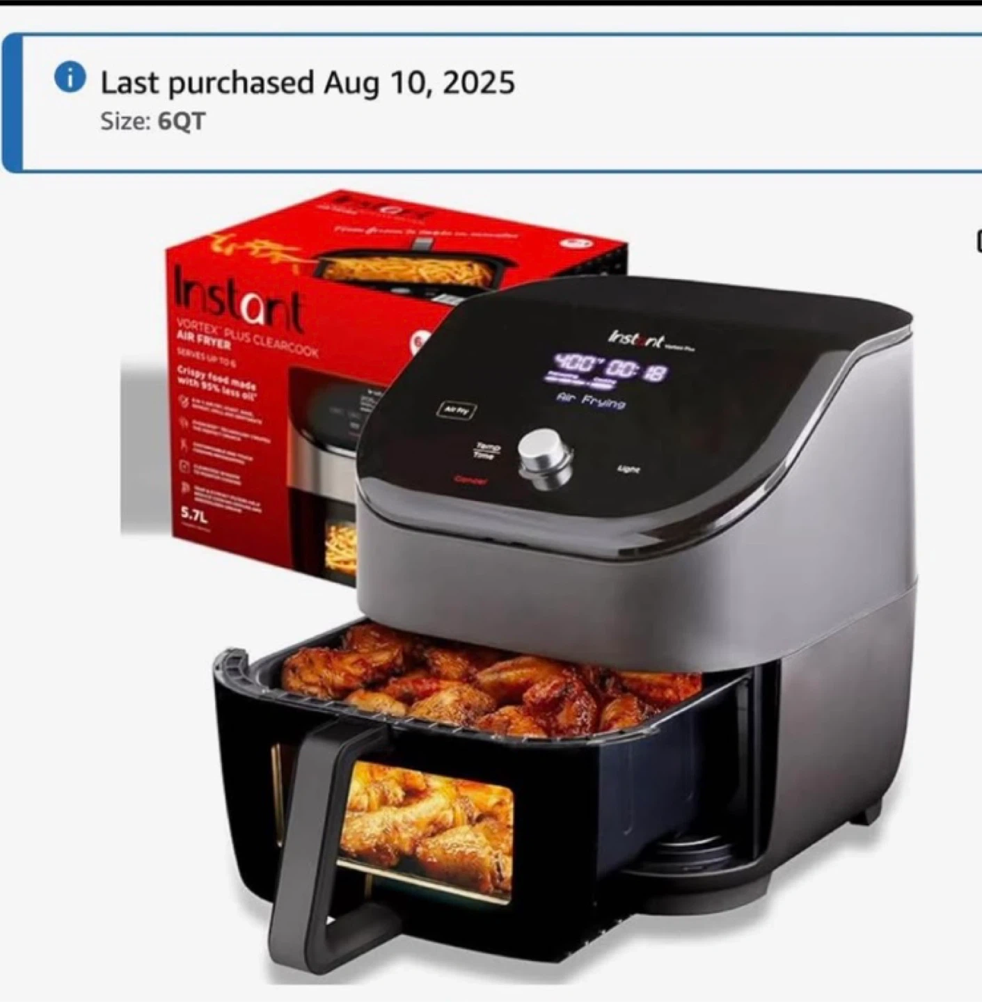 0Selling a slightly used Instant Vortex Plus ClearCook Air Fryer with a 6QT capacity. Purchased August 2025. It has some damage to the handle, as shown in the pictures. Other than the cracked handle it is in great shape! Works beautifully and easy to clean. Pick up only.