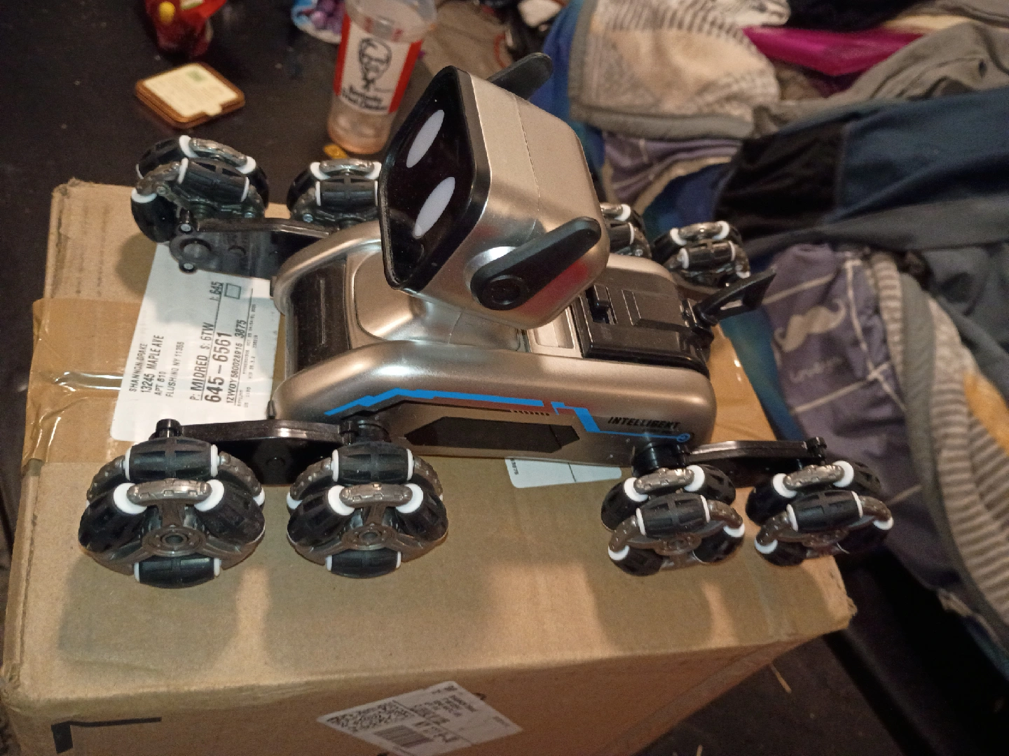 10Selling an intelligent robot toy. It has a silver and black color scheme and interesting wheel design. It is in good condition and ready for a new home!