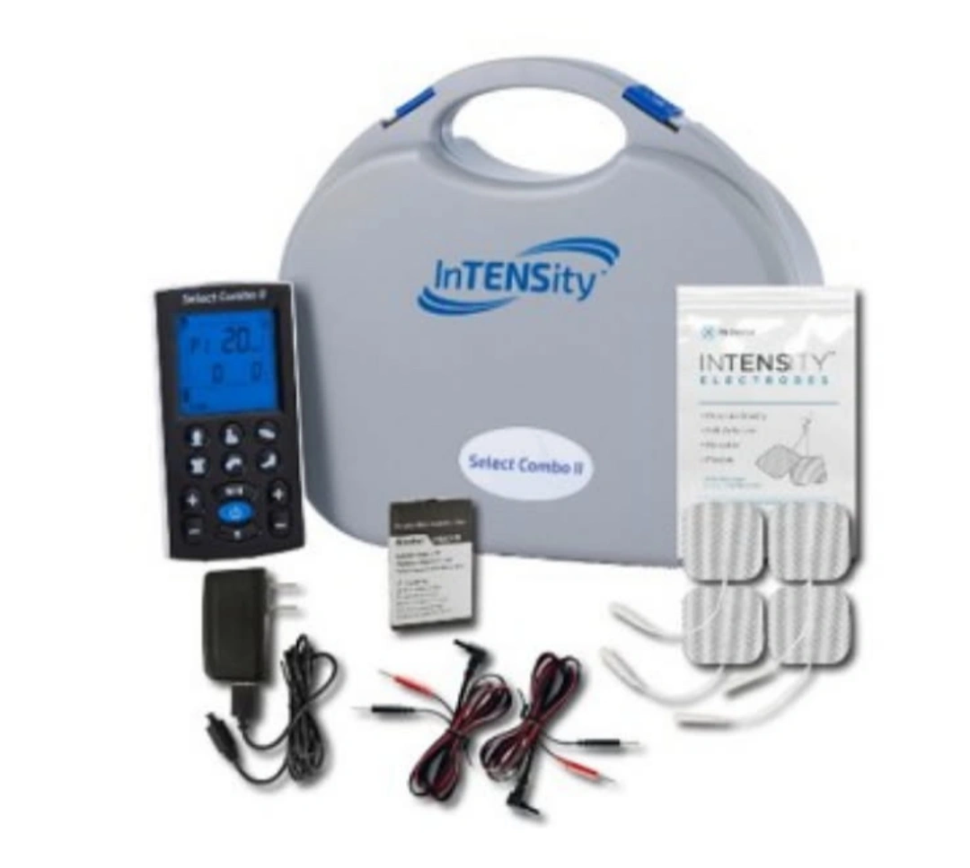Rechargeable TENS, EMS, IF, and Russian Stim 4-in-1 combo device. Includes free therapeutic Iso-Ball and 3oz sub-zero pain relief gel. Comes with carrying case, electrodes, and power adapter.