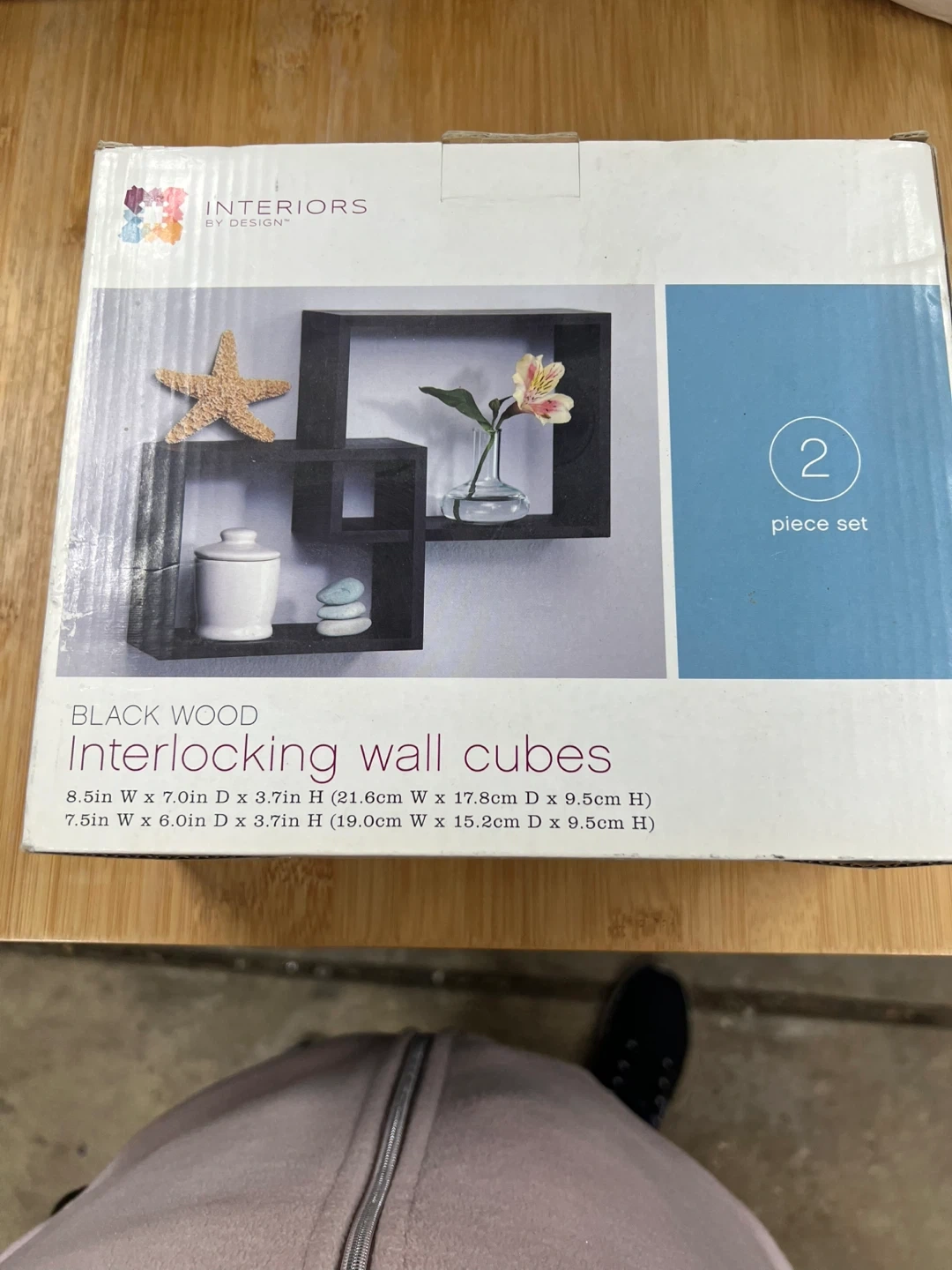 Selling a two-piece set of black wood interlocking wall cubes by Interiors By Design! The dimensions are: - 8.5in W x 7.0in D x 3.7in H (21.6cm W x 17.8cm D x 9.5cm H) - 7.5in W x 6.0in D x 3.7in H (19.0cm W x 15.2cm D x 9.5cm H) Box included