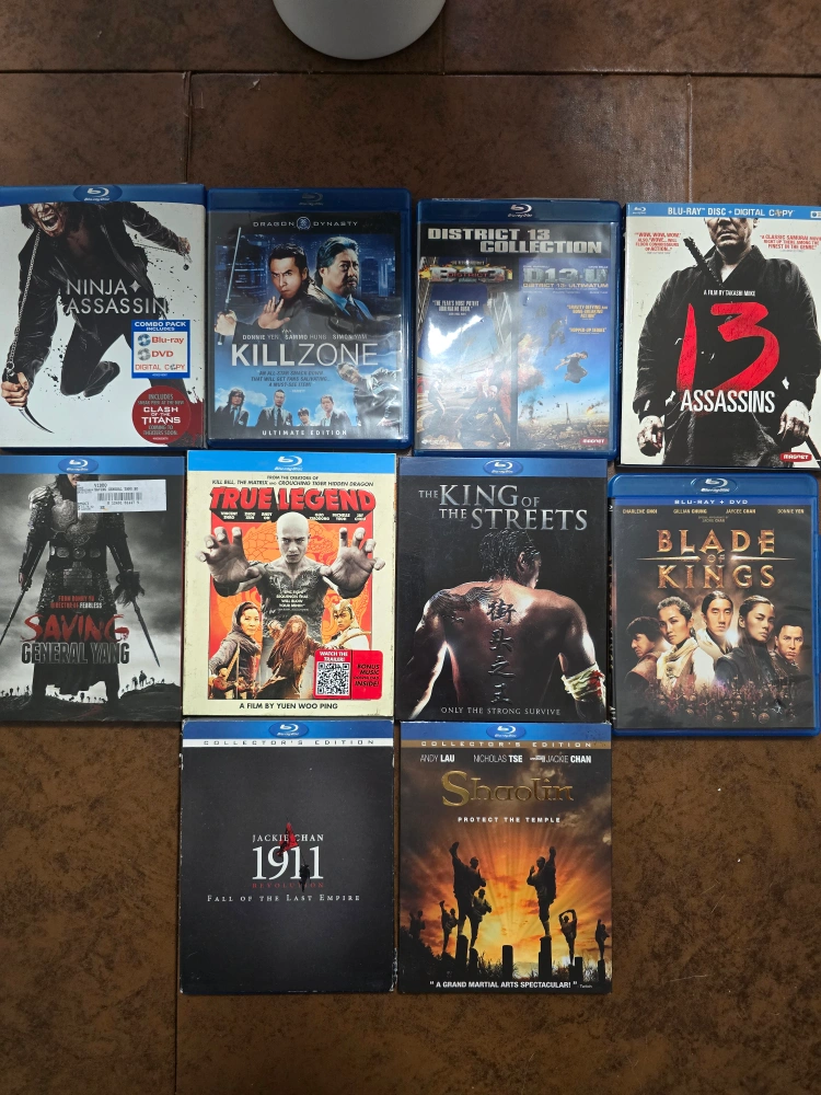 60Selling a collection of Blu-Ray movies. Titles include: -Shaolin(new) -1911 Revolution -Blade of Kings -The King of Streets -Saving General Yang -District 13 -13 Assassins -Ninja Assassin -Killzone Much larger collection willing to work with buyer on other movies and deals. Inquire by messaging.