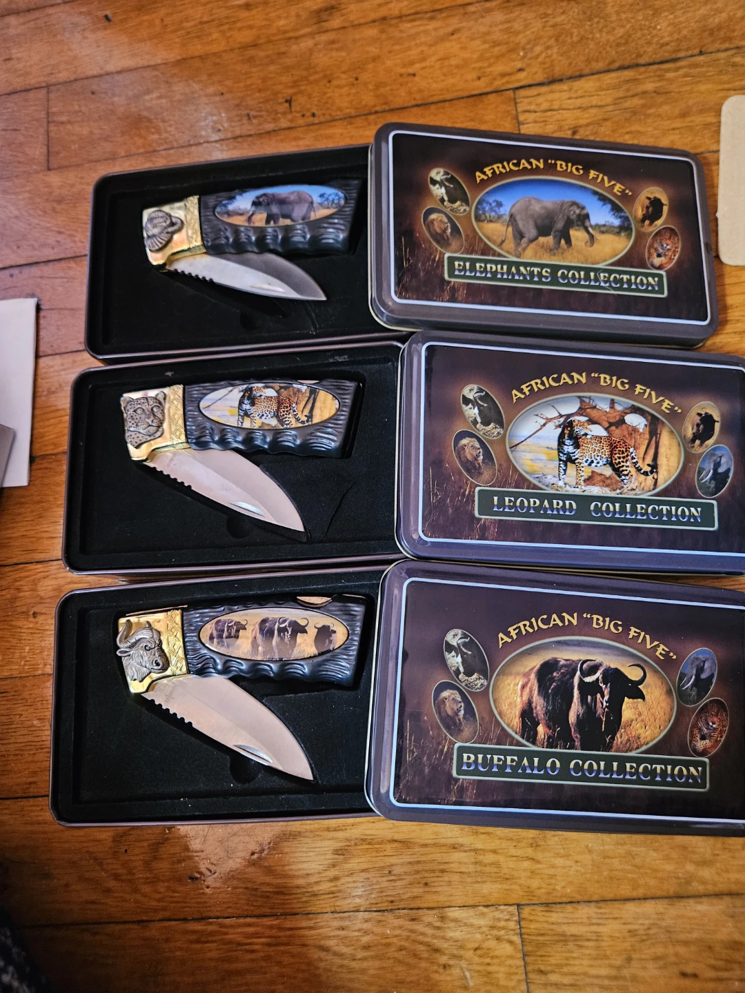 1 / 51 / 5Buy & SellAfrican "Big Five" Collection KnivesAfrican "Big Five" Collection Knives$40African Big Five- Collection, BUFFALO -Leopard-Elephant.Price is for all set.ConditionNewWHERE TO MEETlobby buildingView MapSELLERGraceWindsor Terrace16015 reviews0 chats·1 favorites·38 viewsSEND CHAT TO SELLERHi Grace! I’m interested in your listing.Hi Grace! I’m interested in your listing.Get the Karrot app to chatSign In to chat