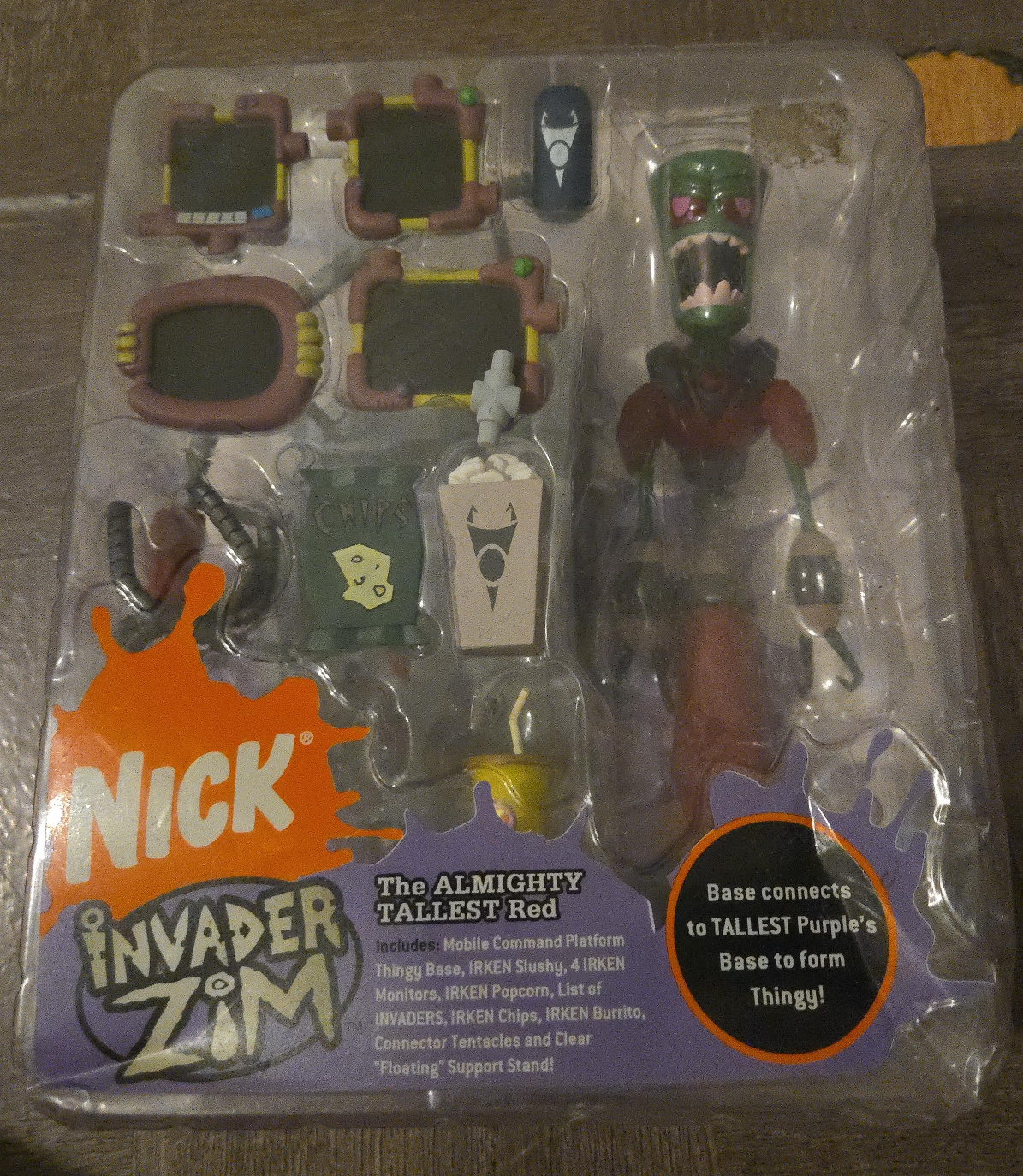 Selling an Invader Zim action figure of The Almighty Tallest Red! It includes: - Mobile Command Platform Thingy Base - IRKEN Slushy - 4 IRKEN Monitors - IRKEN Popcorn - List of INVADERS - IRKEN Chips - IRKEN Burrito - Connector Tentacles - Clear "Floating" Support Stand The base connects to Tallest Purple's base to form Thingy!
