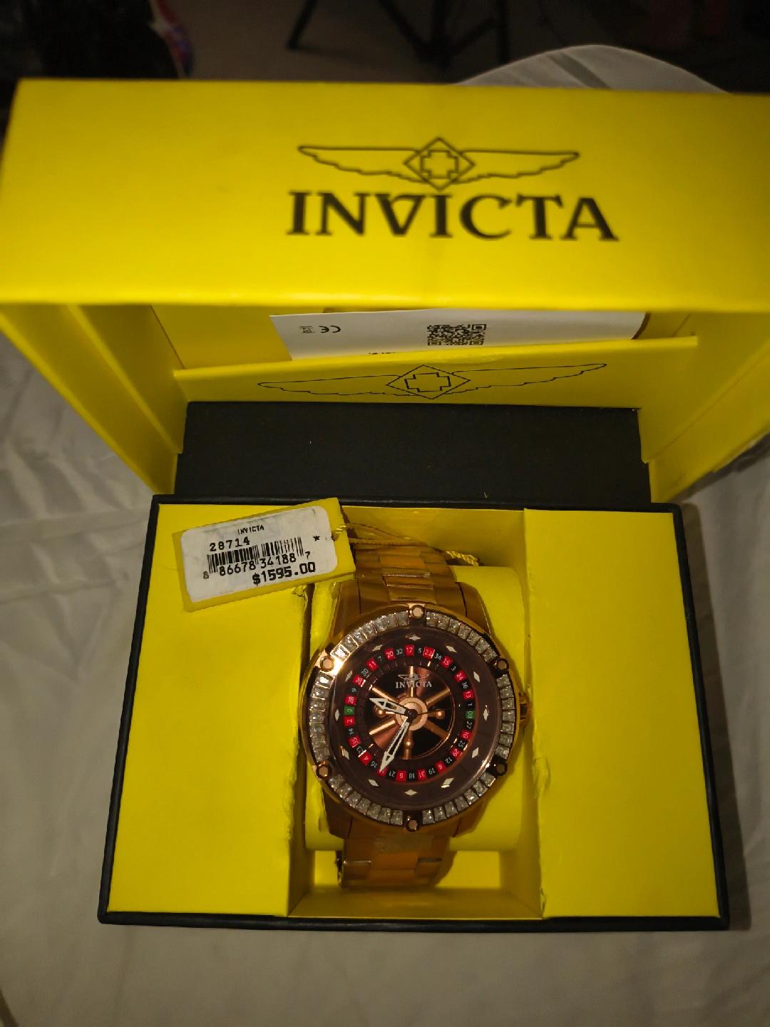 Selling a men's Invicta watch. It comes with its original box and appears to be in great condition. The watch has a brown/gold band and a unique face. Originally priced at $1595.00