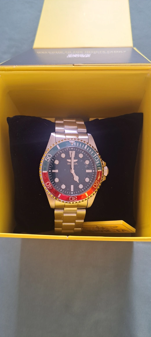 Selling a gold-tone Invicta Pro Diver watch. It comes with its original box. This watch is in great condition and ready to wear!