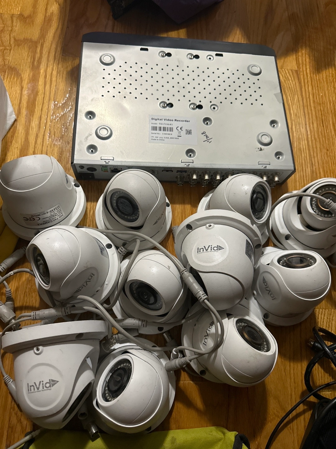 Selling a used InVid security camera system. It includes multiple cameras and a digital video recorder. The model number of the recorder is TVI-7116-K1. The recorder requires 12V 3.33A and 40W MAX