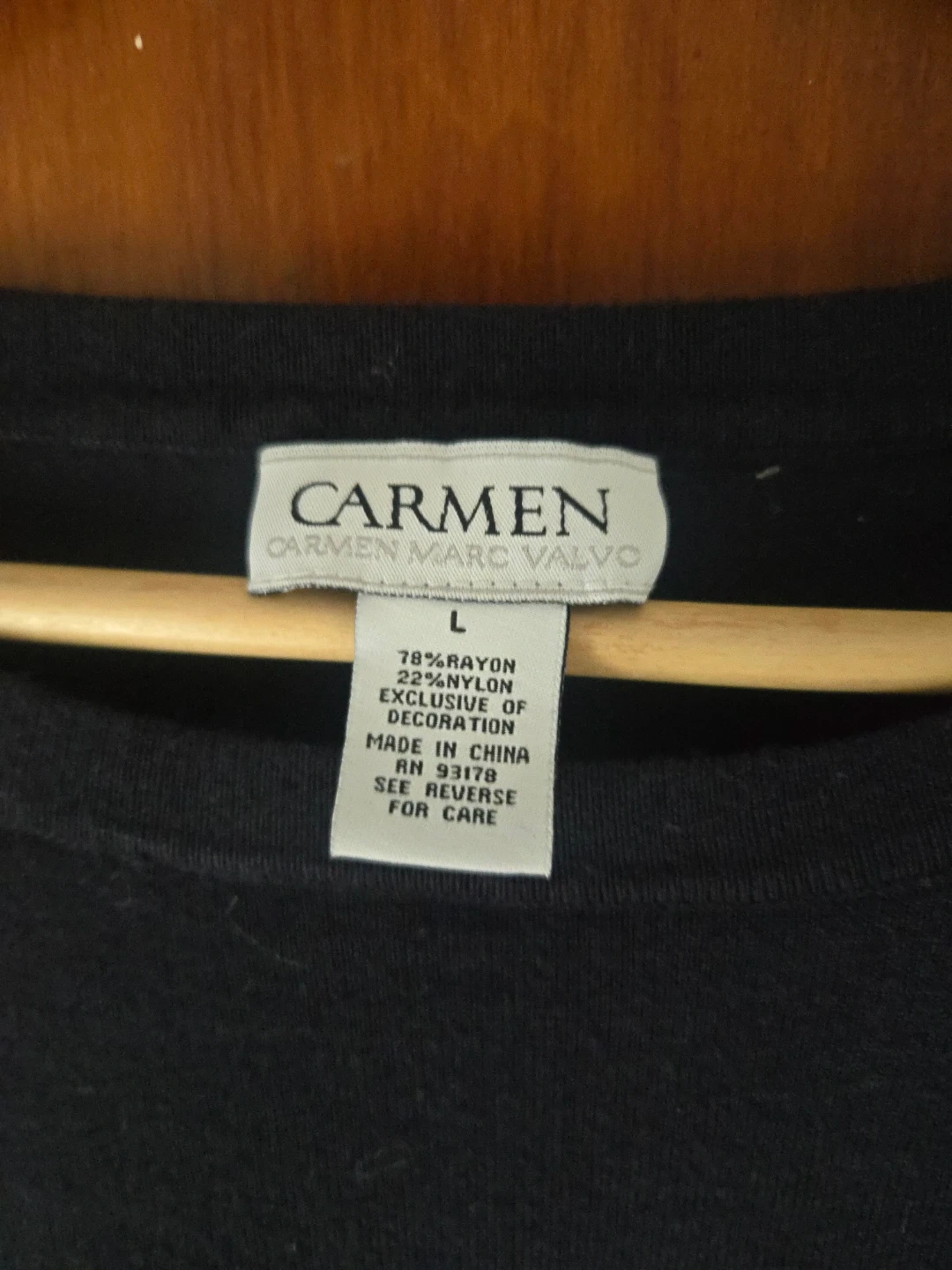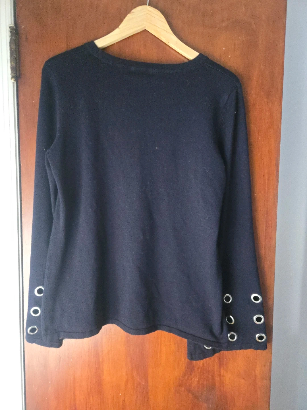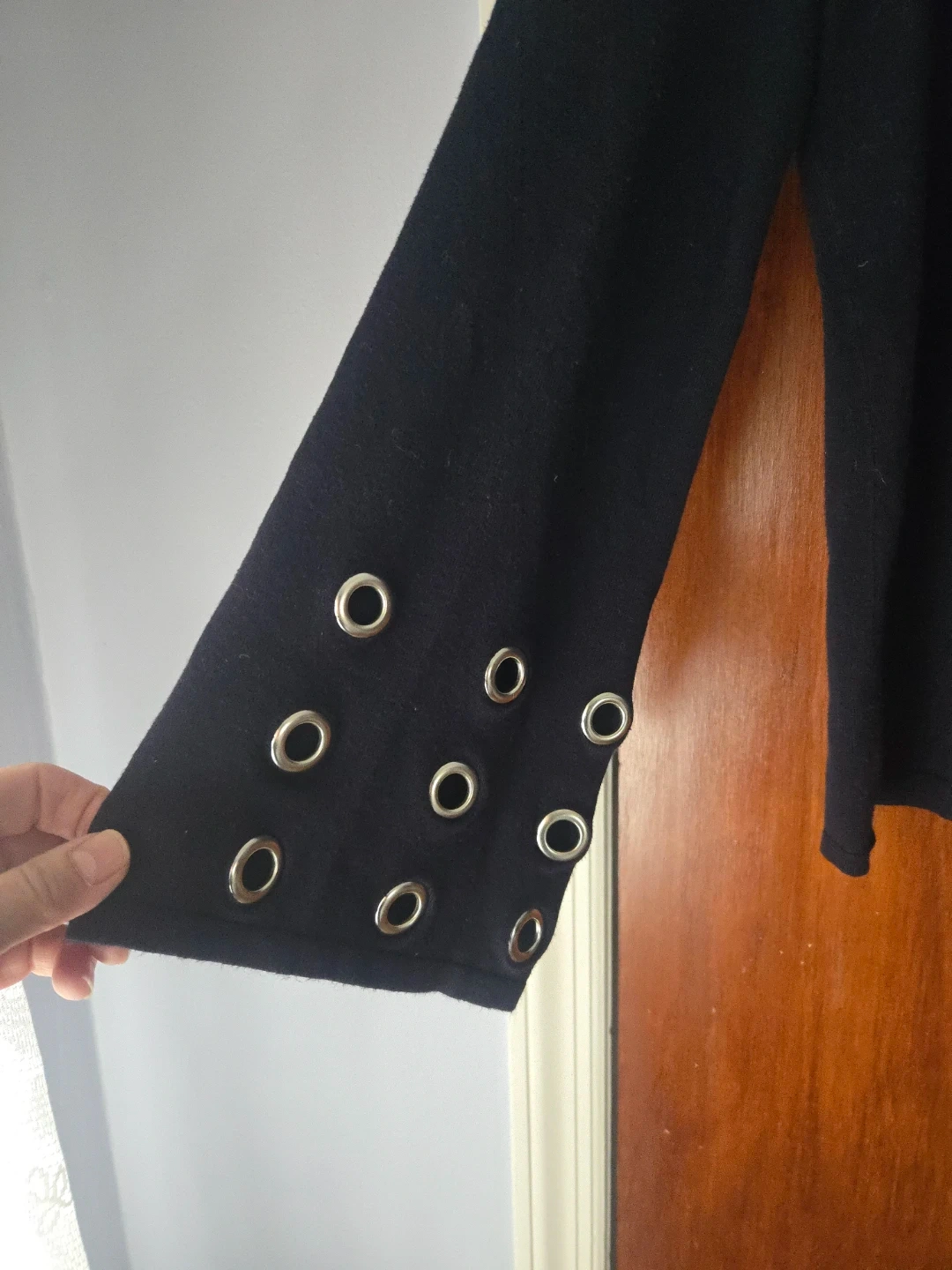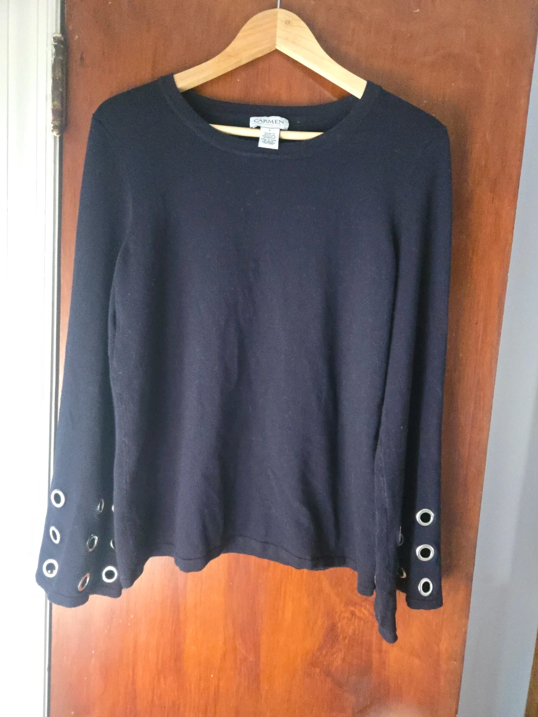 Carmen Marc Valvo black sweater. Features silver grommets on the sleeves. Made of 78% rayon and 22% nylon. Size is large.
