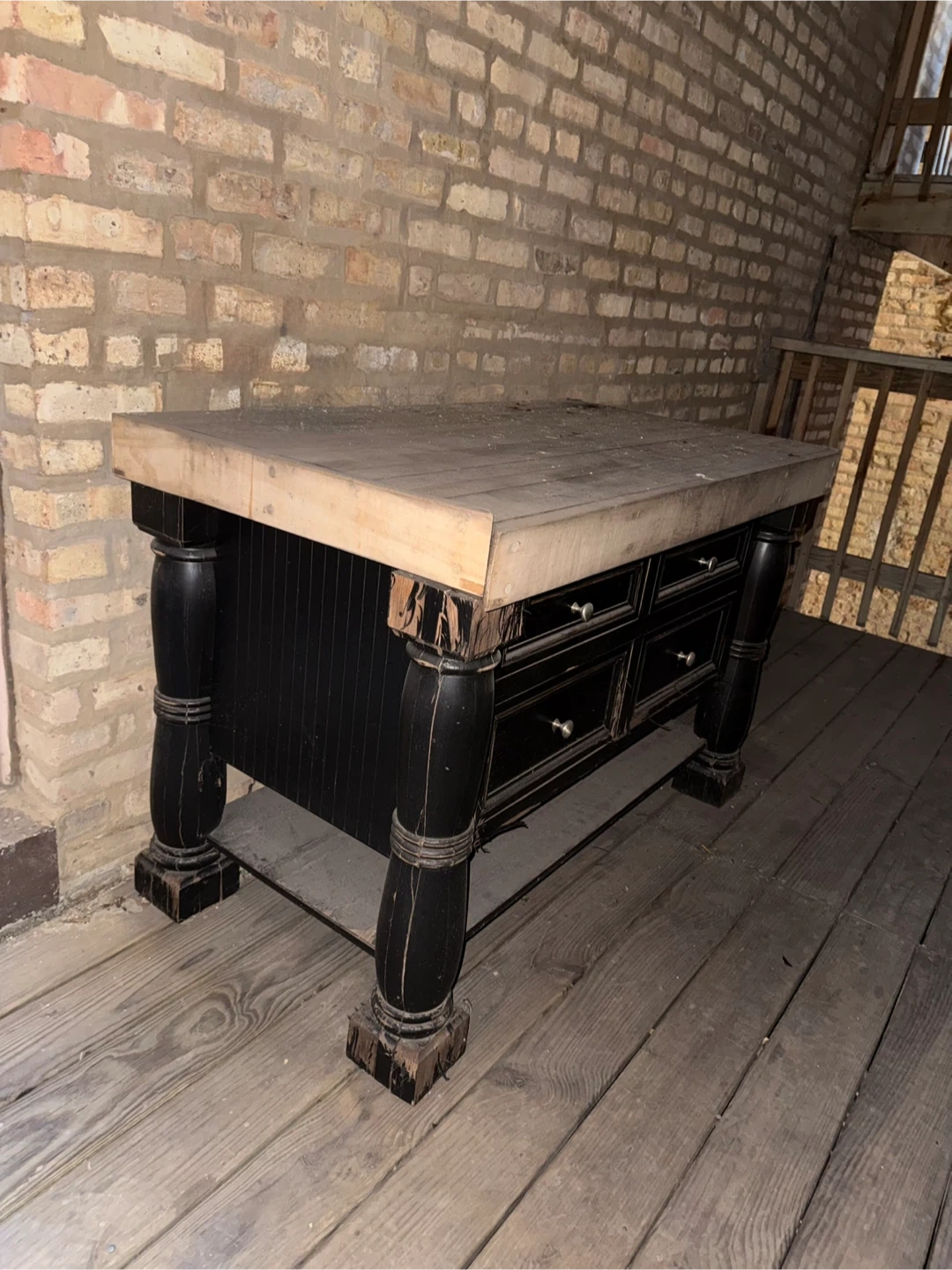 This kitchen island features a butcher block top and a black base with four drawers for storage. This table will definitely need some love - it has been outside for who knows how long. But it’s very heavy and sturdy and could be a beautiful addition!