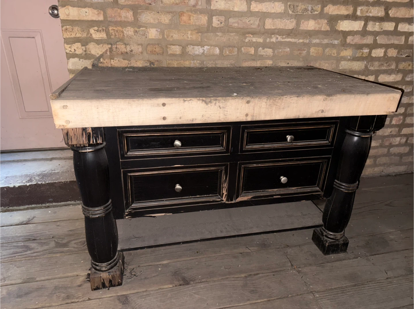 This kitchen island features a butcher block top and a black base with four drawers for storage. This table will definitely need some love - it has been outside for who knows how long. But it’s very heavy and sturdy and could be a beautiful addition!