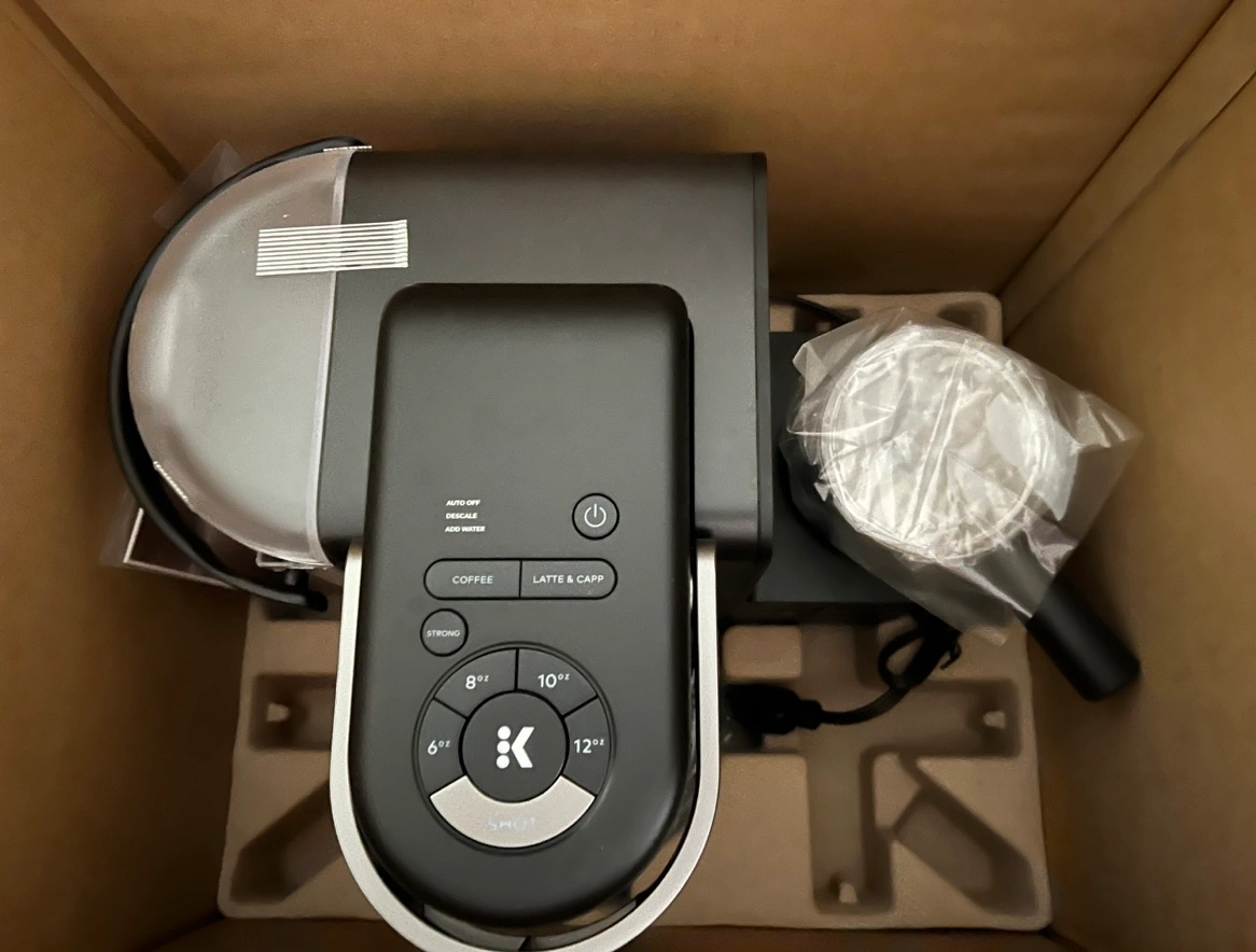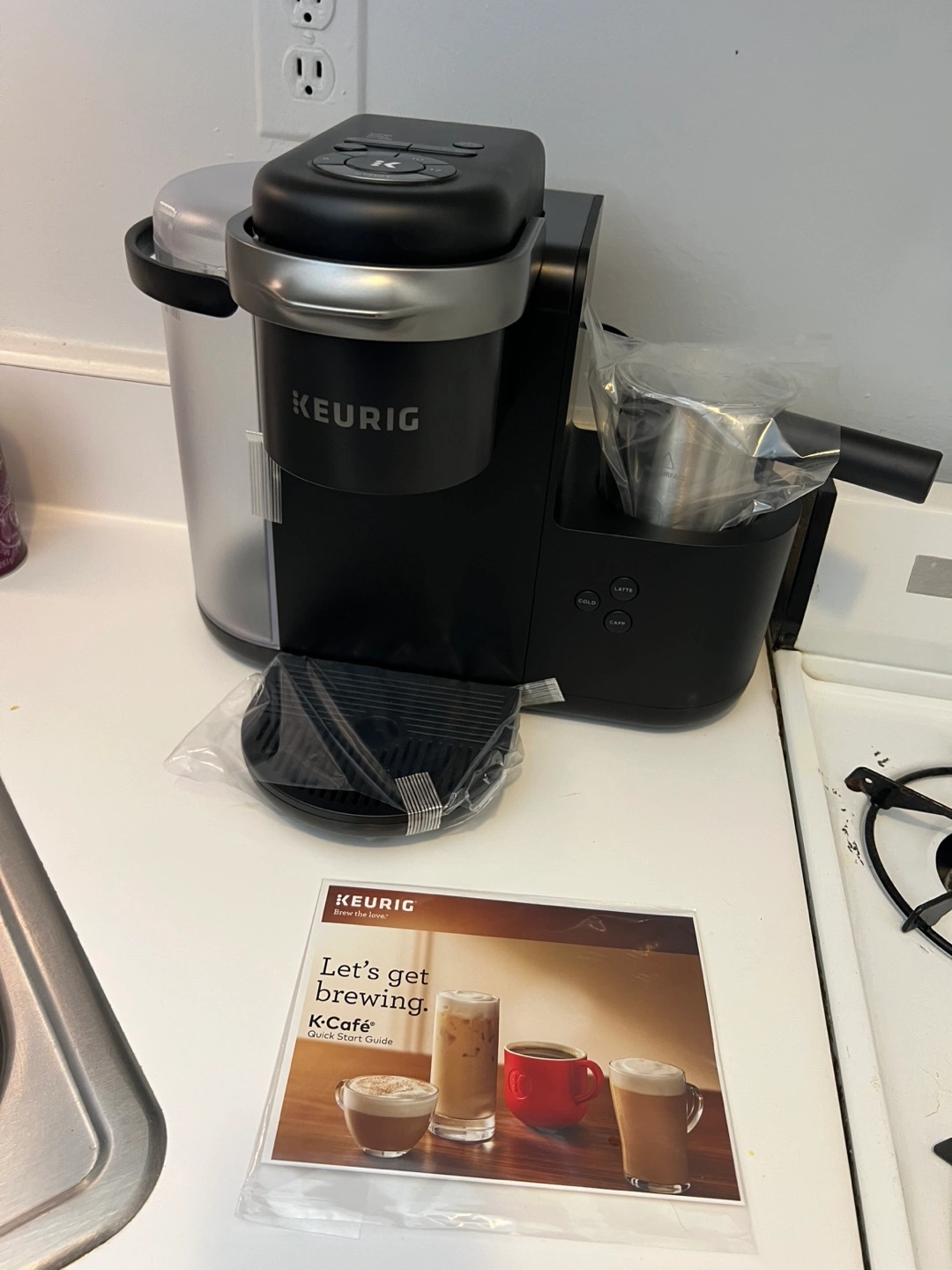 This is a Keurig K-Cafe coffee maker. It comes in a dark charcoal color. This coffee maker can make coffee, lattes, and cappuccinos. It is in new condition and comes in the original box.