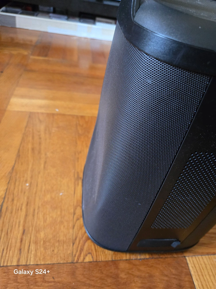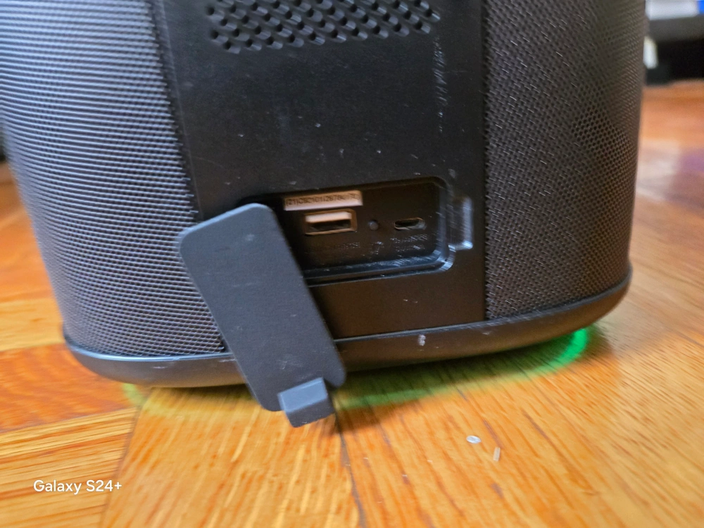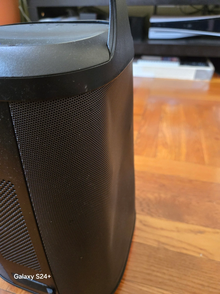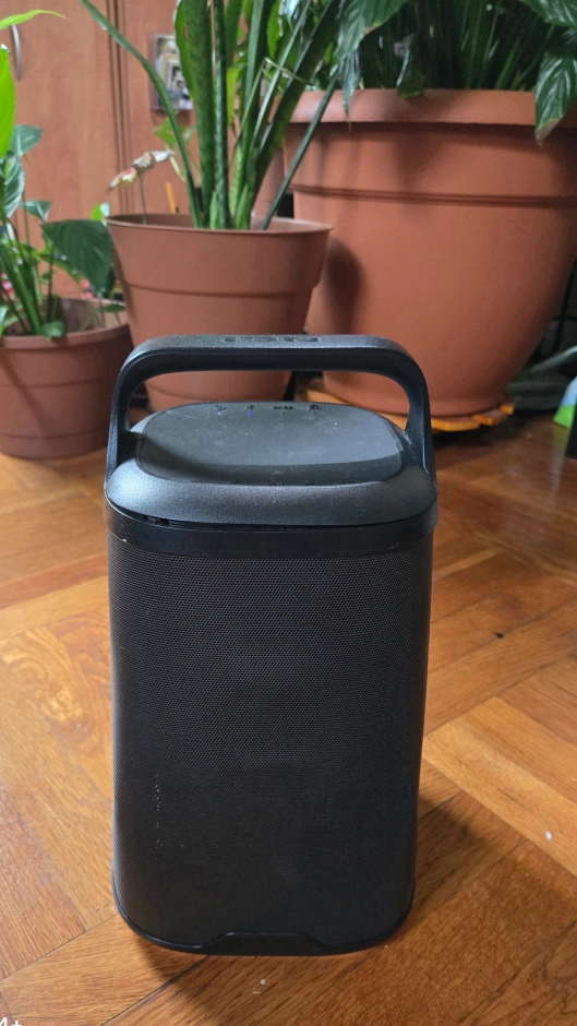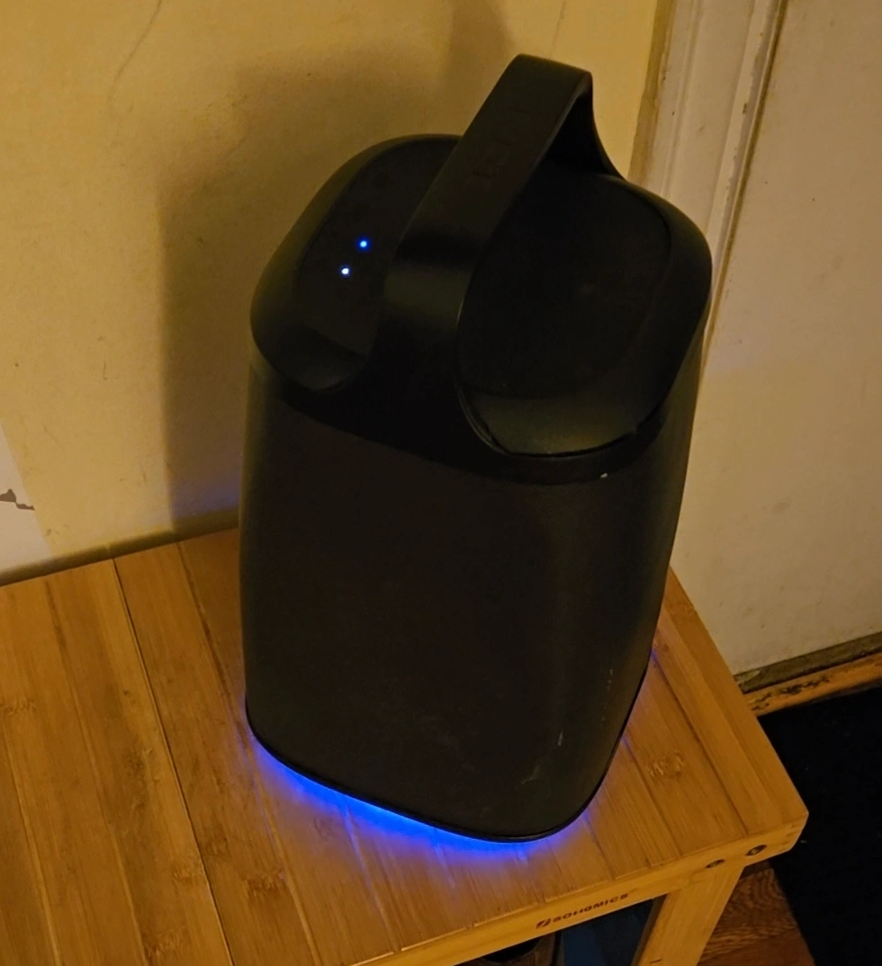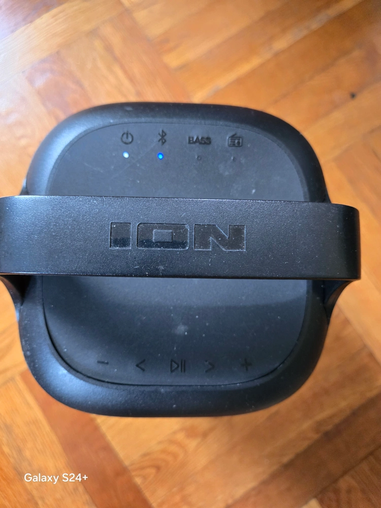 Selling an ION Audio portable Bluetooth speaker. It's black and has a convenient handle for easy carrying. Perfect for indoor and outdoor use! A little dent on the sides but in prefect working condition with underneath lights that flicker to music.