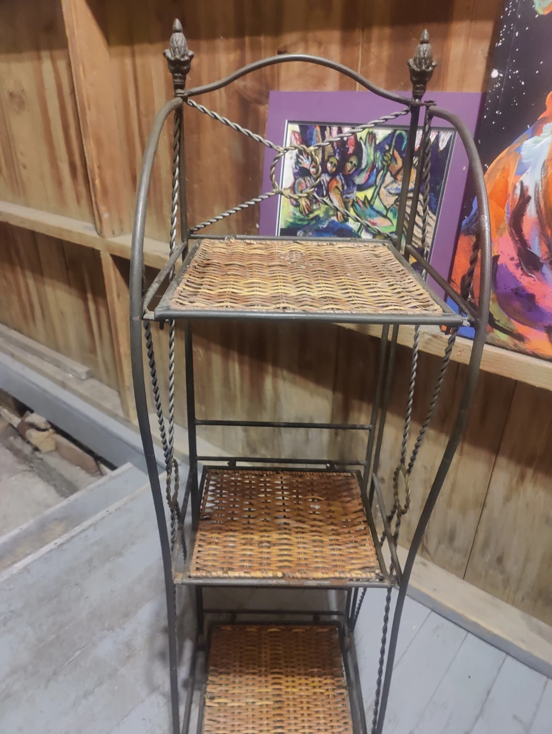 This tiered shelf stand features a metal frame with three wicker shelves. It's ideal for displaying plants or decorative items. The dimensions are approximately 24 inches tall and 12 inches wide.