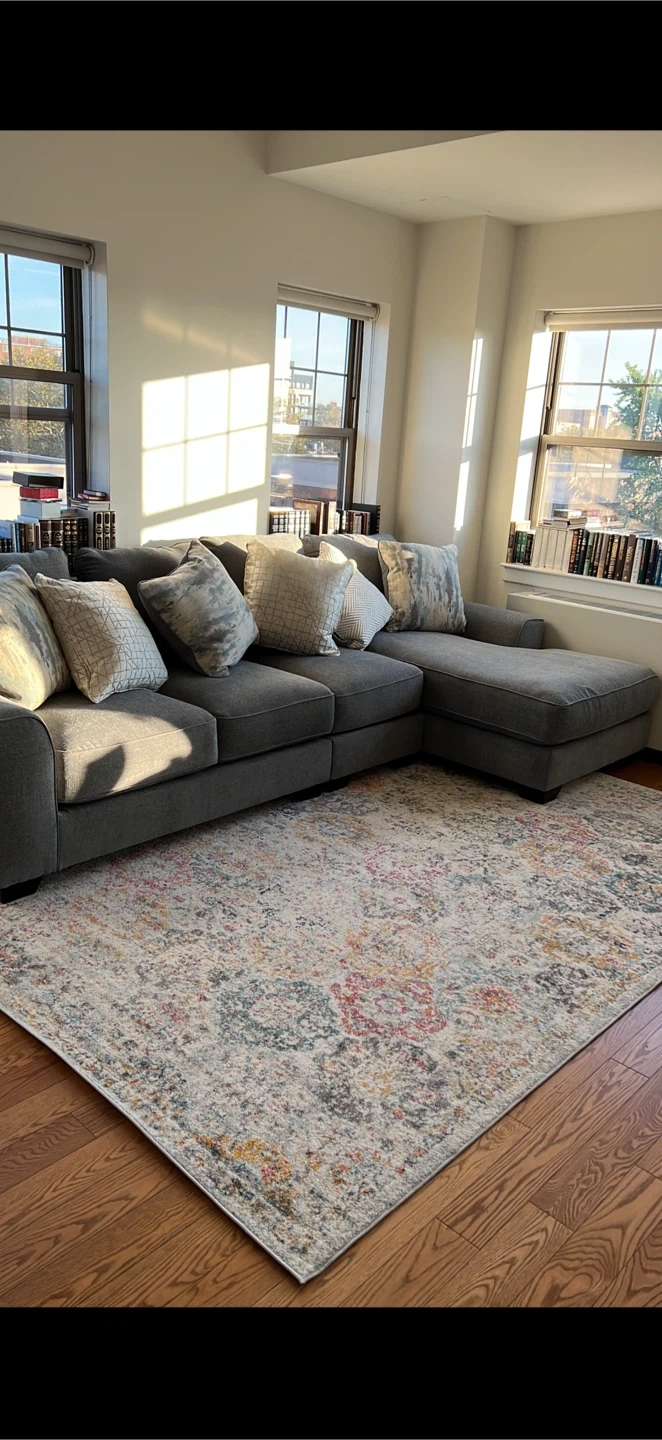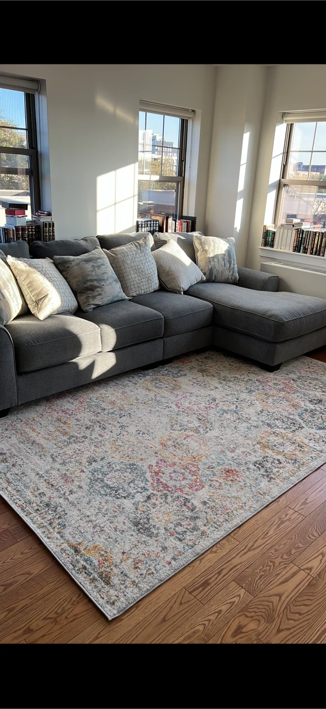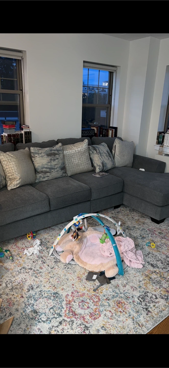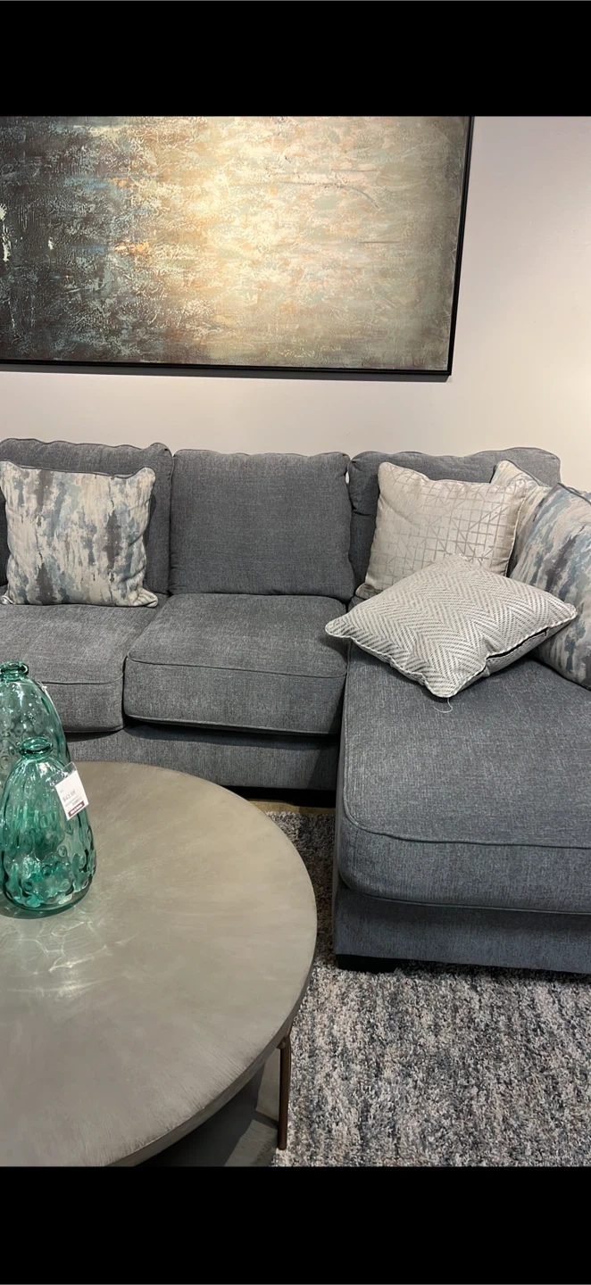 Ashley furniture. Comfortable gray sectional sofa featuring a chaise lounge. Its neutral color makes it versatile for various decor styles. Plenty of seating for family and guests! Customizable to add or remove seating